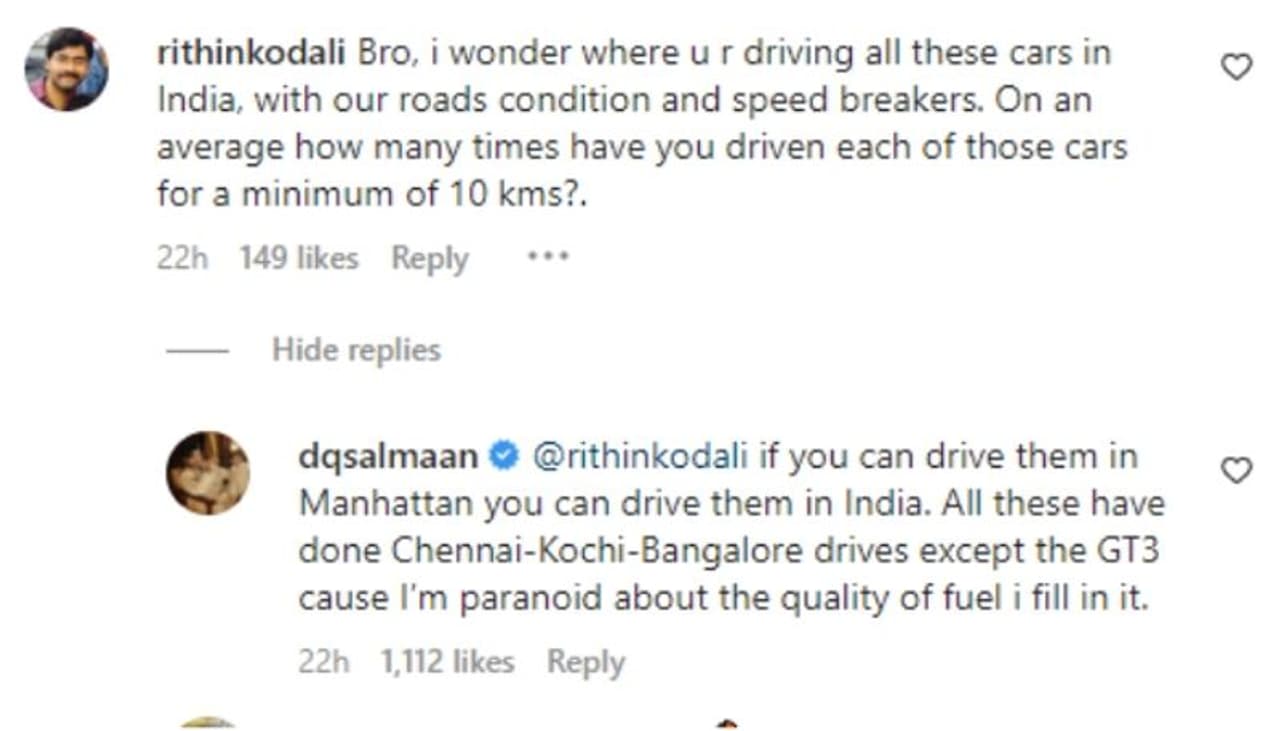 'ബ്രോ നമ്മുടെ നാട്ടിയെ റോഡുകളുടെ അവസ്ഥയും സ്പീഡ് ബ്രേക്കറുകളുമെല്ലാം വച്ച് നിങ്ങള് ഈ കാറുകളെല്ലം ഇന്ത്യയില് എവിടെയാണ് ഓടിക്കുന്നതെന്നാണ് ഞാന് അത്ഭുതപ്പെടുന്നത്. ശാരാശരി 10 കിലോമീറ്ററെങ്കിലും വോഗതയില് നിങ്ങള് ഈ ഓരോ കാറും വിടെ എത്ര തവണ ഓടിച്ചിട്ടുണ്ട്', എന്നായിരുന്നു ആരാധകന്റെ കമന്റ്. ഇത് ശ്രദ്ധയിൽപ്പെട്ട ദുൽഖർ ഉടൻ തന്നെ മറുപടിയും നൽകി.