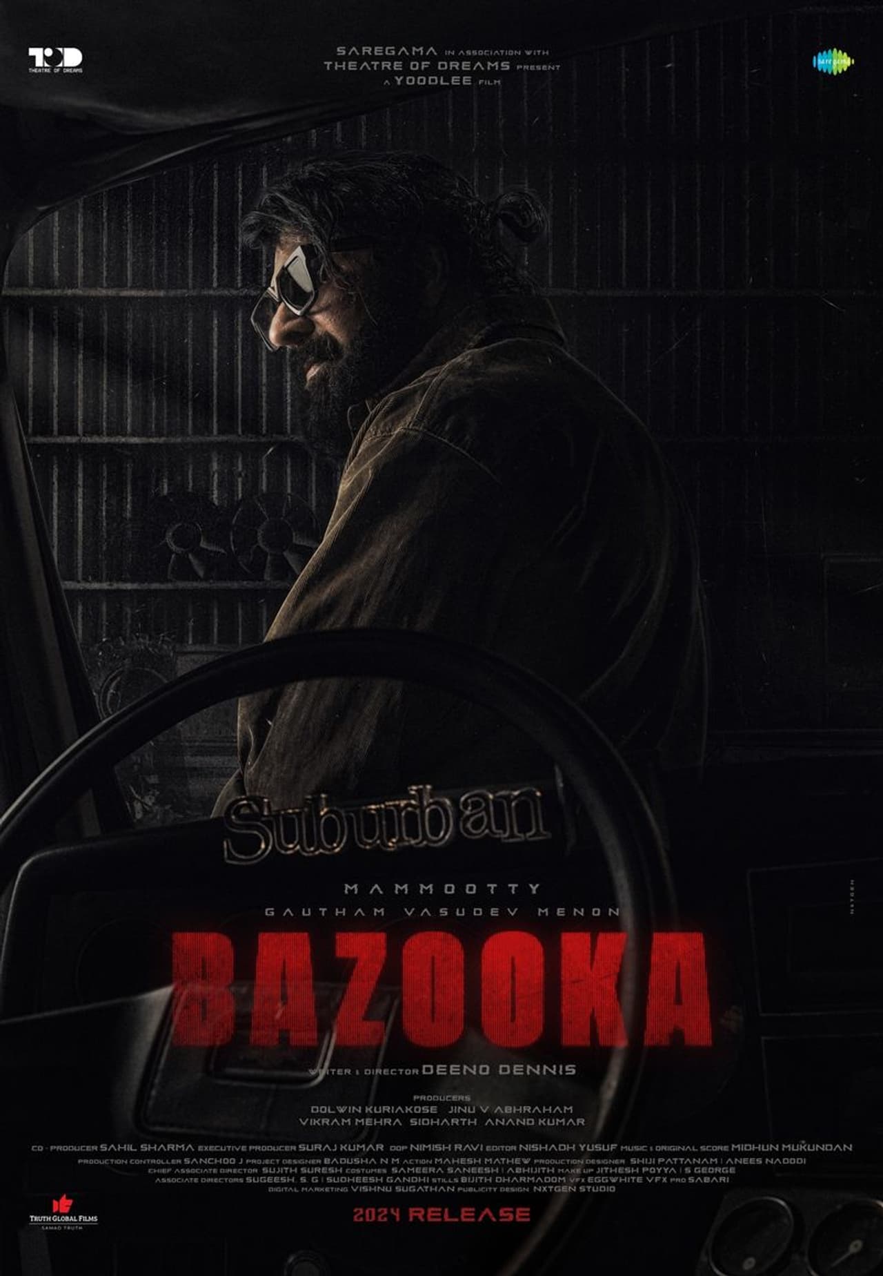 മുടി വളർത്തി, കൂളിംഗ് ക്ലാസ് വച്ച് മാസ് ആയി വണ്ടിക്ക് മുന്നിൽ നിൽക്കുന്ന മമ്മൂട്ടിയെ പോസ്റ്ററിൽ കാണാം. ഒപ്പം 2024ൽ ആകും ബസൂക്ക റിലീസ് ചെയ്യുന്നതെന്നും അറിയിച്ചിട്ടുണ്ട്. ചിത്രത്തിൽ മമ്മൂട്ടിക്കൊപ്പം ഗൗതം വാസുദേവ് മേനോനും പ്രധാന വേഷത്തിൽ എത്തുന്നുണ്ട്. ഇതാദ്യമായാണ് ഇരുവരും ഒന്നിക്കുന്നത്. ഷൈൻ ടോം ചാക്കോ, സണ്ണി വെയ്ൻ, ജഗദീഷ്, ഷറഫുദ്ദിൻ സിദ്ധാർത്ഥ് ഭരതൻ, ഡീൻ ഡെന്നിസ്, സ്ഫടികം ജോർജ്, ദിവ്യാ പിള്ള തുടങ്ങിയവരും പ്രധാന വേഷത്തില് എത്തുന്നുണ്ട്.