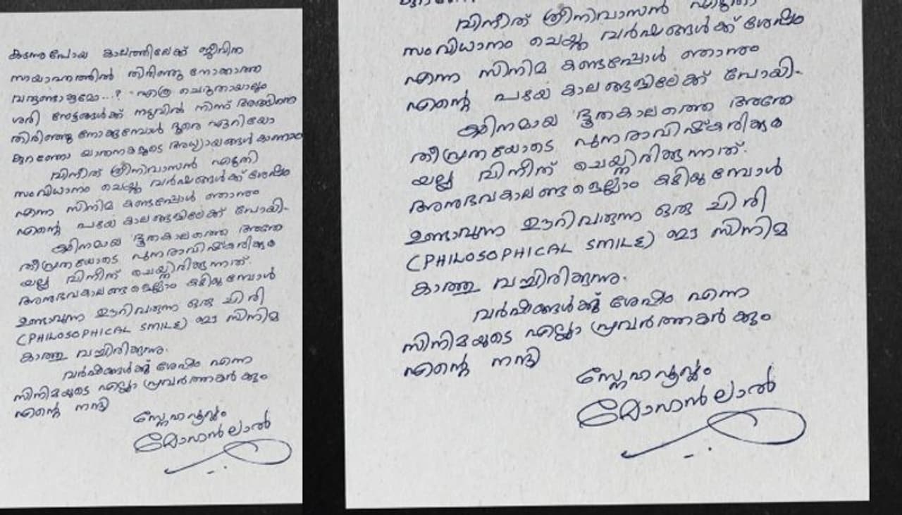 വിനീത് ശ്രീനിവാസൻ സംവിധാനം ചെയ്ത വർഷങ്ങൾക്കു ശേഷം എന്ന സിനിമയ്ക്ക് പ്രശംസയുമായി നടൻ മോഹൻലാൽ. തന്നെയും സിനിമ പഴയ കാലങ്ങളിലേക്ക് കൊണ്ടുപോയെന്നും ചിത്രത്തിന്റെ എല്ലാ പ്രവർത്തകരോടും നന്ദി പറയുന്നുവെന്നും മോഹൻലാൽ കുറിച്ചു. ഭാര്യ സുചിത്രയ്ക്ക് ഒപ്പമാണ് മോഹൻലാൽ സിനിമ കണ്ടത്. ഇതിന്റെ ഫോട്ടോയും സ്വന്തം കൈപ്പടയിൽ എഴുതിയ കുറിപ്പും മോഹൻലാൽ സമൂഹമാധ്യമങ്ങളിൽ പങ്കുവച്ചിട്ടുണ്ട്.
