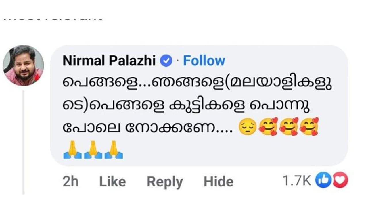 സോഷ്യല് മീഡിയ വളരെ ആവേശത്തോടെയാണ് ഈ വാര്ത്തയെ ഏറ്റെടുത്തത്. നടന് നിർമൽ പാലാഴി സജീഷ് പ്രതിഭ വിവാഹത്തിന്റെ ഒരു വീഡിയോയ്ക്ക് ഇട്ട കമന്റാണ് ഇപ്പോള് വൈറലാകുന്നത്. പെങ്ങളെ…ഞങ്ങളെ(മലയാളികളുടെ)പെങ്ങളെ കുട്ടികളെ പൊന്നു പോലെ നോക്കണേ എന്നാണ് വീഡിയോക്ക് താഴെ നിര്മ്മല് എഴുതിയത്. ഒരുപാട് പേർ നിര്മ്മലിന്റെ കമന്റിന് ലൈക്ക് നല്കിയിട്ടുണ്ട്. മക്കളെ പൊന്നുപോലെ നോക്കണേ എന്നാണ് കമന്റുകൾ കൂടുതലും.
