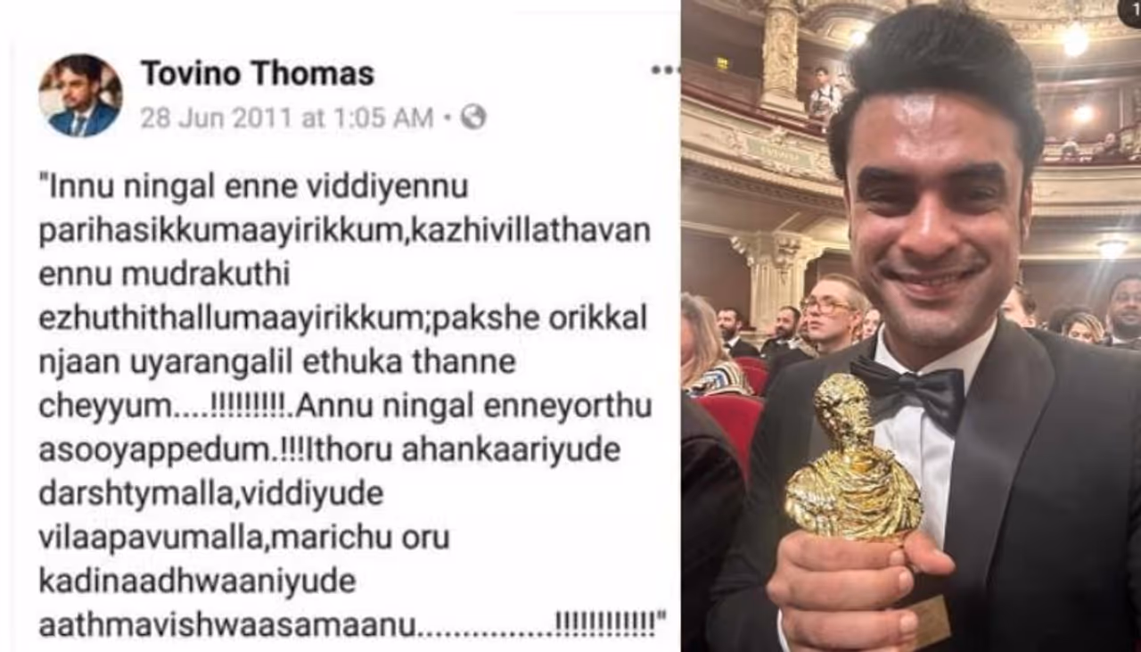 മലയാള സിനിമ ലോകമ്പൊടുമായി അറിയപ്പെടുന്നതിനിടെ ടൊവിനോ തോമസിന്റെ പഴയൊരു പോസ്റ്റാണ് വീണ്ടും വൈറൽ ആകുന്നത്. 2011 ജൂണിൽ ആണ് ടൊവിനോ ഈ പോസ്റ്റ് സോഷ്യൽ മീഡിയയിൽ പങ്കുവച്ചത്. "ഇന്നു നിങ്ങള് എന്നെ വിഡ്ഢിയെന്ന് പരിഹസിക്കുമായിരിക്കും, കഴിവില്ലാത്തവന് എന്ന് മുദ്രകുത്തി എഴുതിത്തള്ളുമായിരിക്കും. പക്ഷേ ഒരിക്കല് ഞാന് ഉയരങ്ങളില് എത്തുക തന്നെ ചെയ്യും. അന്ന് നിങ്ങള് എന്നെ ഓര്ത്ത് അസൂയപ്പെടും. ഇതൊരു അഹങ്കാരിയുടെ ധാര്ഷ്ട്യമല്ല, വിഡ്ഢിയുടെ വിലാപവുമല്ല. മറിച്ച് ഒരു കഠിനാദ്ധ്വാനിയുടെ ആത്മവിശ്വാസമാണ്", എന്നായിരുന്നു ടൊവിനോയുടെ വാക്കുകൾ. ടൊവിനോയുടെ പോസ്റ്റുകൾക്ക് താഴെ ഈ കുറിപ്പ് പങ്കുവച്ച് നിരവധി പേരാണ് രംഗത്ത് എത്തുന്നത്.