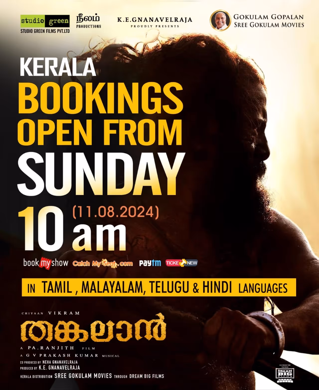 തമിഴ് സൂപ്പർ താരം വിക്രമിനെ നായകനാക്കി പാ രഞ്ജിത് സംവിധാനം ചെയ്ത ചിത്രമാണ് തങ്കലാൻ. ചിത്രം ഓഗസ്റ്റ് പതിനഞ്ചിന് ആഗോള റിലീസായി തിയറ്ററുകളിൽ എത്തും. അതിന് മുന്നോടിയായി ചിത്രത്തിന്റെ കേരളാ അഡ്വാൻസ് ബുക്കിംഗ് ആരംഭിച്ചിരിക്കുകയാണ് ഇപ്പോൾ. വിക്രമിനൊപ്പം പാർവതി തിരുവോത്ത്, മാളവിക മോഹനൻ എന്നിവർ ശക്തമായ കേന്ദ്രകഥാപാത്രങ്ങളെ അവതരിപ്പിക്കുന്നുണ്ട്.