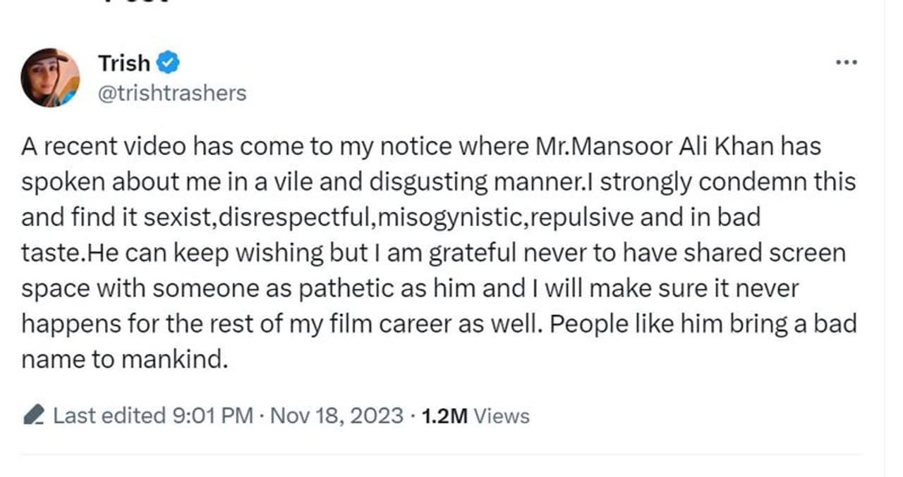 "മൻസൂർ അലി ഖാൻ എന്നെക്കുറിച്ച് നീചവും വെറുപ്പുളവാക്കുന്നതുമായ രീതിയിൽ സംസാരിച്ച ഒരു വീഡിയോ അടുത്തിടെ കാണാൻ ഇടയായി. ഞാൻ അതിൽ ശക്തമായി അപലപിക്കുകയാണ്. ലൈംഗികl, അനാദരവ്, സ്ത്രീവിരുദ്ധത, വെറുപ്പുളവാക്കുന്ന, മോശം അഭിരുചിയുള്ള ഒരാളുടെ പ്രസ്താവനയാണത്. ഇയാൾക്കൊപ്പം ഒരിക്കലും സ്ക്രീൻ സ്പേസ് പങ്കിടാത്തതിൽ ഞാൻ ഇപ്പോൾ സന്തോഷവതിയാണ്, എന്റെ സിനിമാ ജീവിതത്തിന്റെ ബാക്കി ഭാഗങ്ങളിലും അതൊരിക്കലും സംഭവിക്കില്ലെന്ന് ഞാൻ ഉറപ്പുവരുത്തും. അയാളെ പോലുള്ളവർ മനുഷ്യരാശിക്ക് തന്നെ അപമാനമാണ്", എന്നാണ് തൃഷ കുറിച്ചത്.