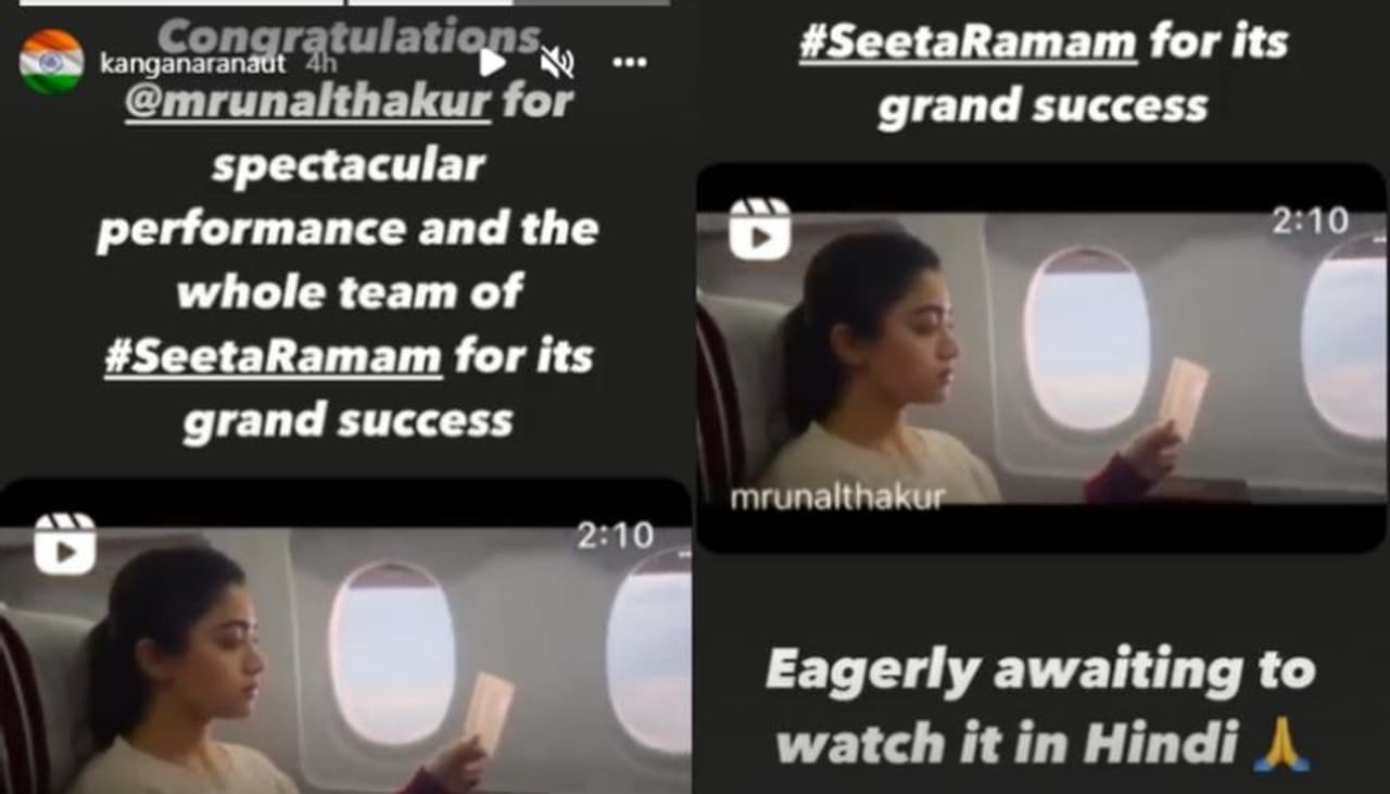 ചിത്രത്തിൽ മൃണാള് താക്കൂറിന്റേത് മികച്ച പ്രകടനമായിരുന്നുവെന്ന് കങ്കണ പറഞ്ഞു. സിനിമയുടെ ഹിന്ദി പതിപ്പ് കാണാനായി കാത്തിരിക്കുകയാണെന്നും കങ്കണ ഇന്സ്റ്റഗ്രാം സ്റ്റോറിയിൽ കുറിച്ചു.'അതിശയകരമായ പ്രകടനത്തിന് മൃണാള് താക്കൂറിനും സീതാ രാമത്തിന്റെ മികച്ച വിജയത്തിന് മുഴുവന് ടീമിനും അഭിനന്ദനങ്ങള്, ഹിന്ദി പതിപ്പ് കാണാനായി ആകാംക്ഷയോടെ കാത്തിരിക്കുന്നു' എന്നാണ് കങ്കണ കുറിച്ചത്.