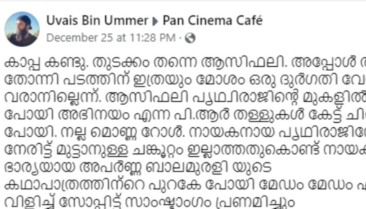 കാപ്പ കണ്ടു. തുടക്കം തന്നെ ആസിഫലി. അപ്പോൾ തന്നെ തോന്നി പടത്തിന് ഇത്രയും മോശം ഒരു ദുർഗതി വേറേ വരാനില്ലെന്ന്. ആസിഫലി പൃഥ്വിരാജിൻ്റെ മുകളിൽ പോയി അഭിനയം എന്ന പി.ആർ തള്ളുകൾ കേട്ട് ചിരിച്ചു പോയി. നല്ല മൊണ്ണ റോൾ. നായകനായ പൃഥിരാജിനോട് നേരിട്ട് മുട്ടാനുള്ള ചങ്കൂറ്റം ഇല്ലാത്തതുകൊണ്ട് നായകൻ്റെ ഭാര്യയായ അപർണ്ണ ബാലമുരളി യുടെ കഥാപാത്രത്തിന്റെ പുറകേ പോയി മേഡം മേഡം എന്നു വിളിച്ച് സോപ്പിട്ട് സാംഷ്ടാംഗം പ്രണമിച്ചും ഭവ്യതകാണിച്ചും കാര്യം നേടുന്ന അയ്യോ പാവം റോൾ. പല സീനിലും അപർണയോട് തൊഴുകൈയ്യോടെ മേഡം വിളിയോടേ പെരുമാറുന്ന ആസിഫിന്റെ അഭിനയം വളരേ ആർട്ടിഫിഷ്യൽ ആയി തോന്നി. ഭാവം തീരെ വരാത്ത ഉറക്കം തൂങ്ങിയ കാരക്ടർ.