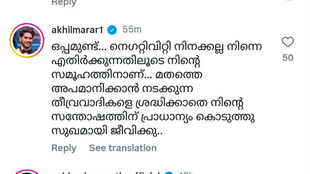 'ഒപ്പമുണ്ട്..നെഗറ്റിവിറ്റി നിനക്കല്ല നിന്നെ എതിര്ക്കുന്നതിലൂടെ നിന്റെ സമൂഹത്തിനാണ്. മതത്തെ അപമാനിക്കാന് നടക്കുന്ന തീവ്രവാദികളെ ശ്രദ്ധിക്കാതെ നിന്റെ സന്തോഷത്തിന് പ്രാധാന്യം കൊടുത്ത് സുഖമായി ജീവിക്കൂ..', എന്നായിരുന്നു അഖിൽ മാരാരുടെ കമന്റ്.