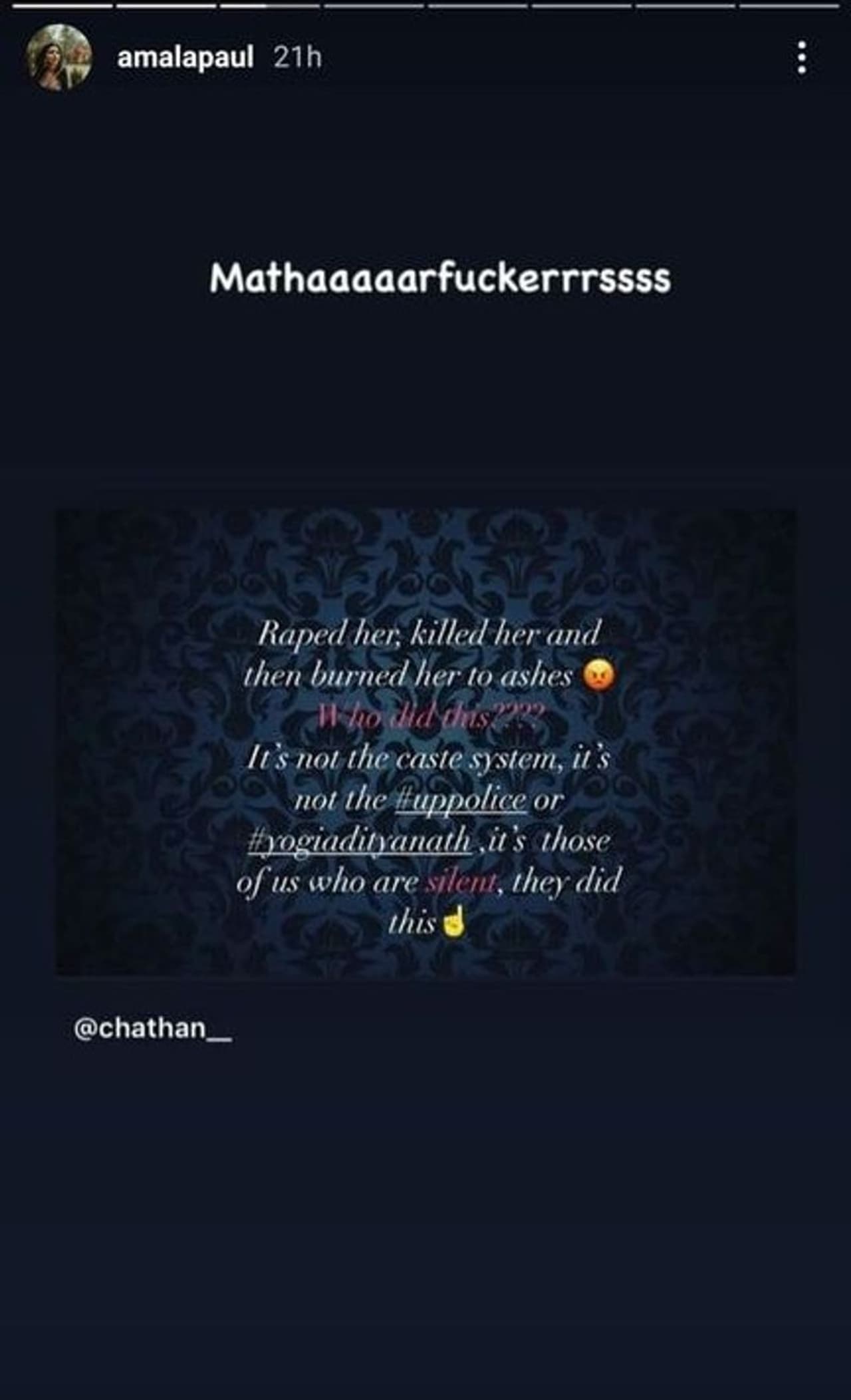 "ബലാല്സംഗം ചെയ്ത്, കൊന്നിട്ട് അവളെ ചാരമാക്കി കളഞ്ഞു. ആരാണ് ഇത് ചെയ്തത്? അത് ജാതി വ്യവസ്ഥയോ യുപി പൊലീസോ യോഗി ആദിത്യനാഥോ അല്ല. നിശബ്ദരായിരിക്കുന്ന നമ്മളാണ്, നമ്മളാണ് ഇത് ചെയ്തത്" എന്നാണ് അമല പോളിന്റെ ഇന്സ്റ്റഗ്രാം സ്റ്റോറി പോസ്റ്റ്. @Chathan_ എന്ന അക്കൌണ്ടിനെ ഉദ്ധരിച്ചാണ് അമലയുടെ ഇന്സ്റ്റഗ്രാം സ്റ്റോറി.
