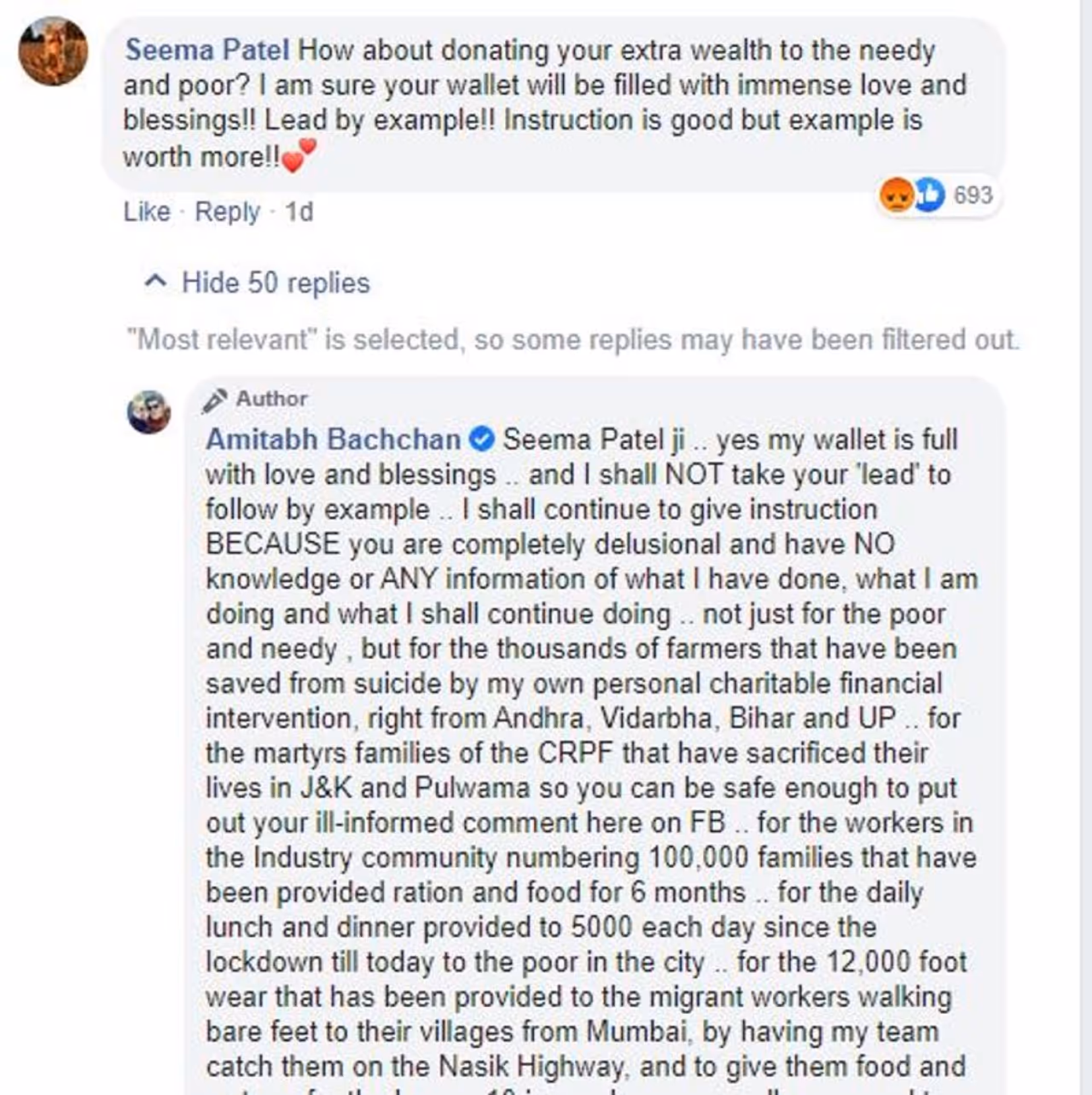 എന്നാല് തന്നെ പ്രകോപിപ്പിച്ച ചോദ്യത്തിന് വിശദമായ മറുപടി അദ്ദേഹം ഫേസ്ബുക്കില് തന്നെ നല്കി. നിങ്ങള് പറഞ്ഞതുപോലെ എന്റെ പഴ്സ് സ്നേഹാനുഗ്രങ്ങള് നിറഞ്ഞതാണെന്നു പറഞ്ഞുകൊണ്ടാണ് ബച്ചന്റെ മറുപടിയുടെ തുടക്കം. തുടര്ന്ന് എവിടെയും ഇതുവരെ പറയാതിരുന്ന, പ്രത്യേകിച്ചും കൊവിഡ് കാലത്ത് വ്യക്തിപരമായി താന് നല്കിക്കൊണ്ടിരിക്കുന്ന സഹായങ്ങളെക്കുറിച്ചും അമിതാഭ് ബച്ചന് കുറിച്ചു. "ആന്ധ്രയിലെയും വിദര്ഭയിലെയും ബിഹാറിലെയും യുപിയിലെയും ആയിരക്കണക്കിനു കര്ഷകരെ ആത്മഹത്യാമുനമ്പില് നിന്നും എനിക്ക് രക്ഷിക്കാനായിട്ടുണ്ട്. പുല്വാമയില് ജീവന് ബലിയര്പ്പിച്ച സിആര്പിഎഫ് ജവാന്മാരുടെ കുടുംബങ്ങള്ക്ക് സഹായം നല്കാനായി. ഒരു ലക്ഷം തൊഴിലാളി കുടുംബങ്ങള്ക്ക് ആറുമാസക്കാലം ഭക്ഷണവും റേഷനും നല്കാന് കഴിഞ്ഞു. നഗരത്തിലെ പാവപ്പെട്ട അയ്യായിരം പേര്ക്ക് ലോക്ക് ഡൗണ് ആരംഭിച്ചതുമുതല് ഇന്നുവരെ ഉച്ചഭക്ഷണവും അത്താഴവും നല്കാന് കഴിഞ്ഞു."