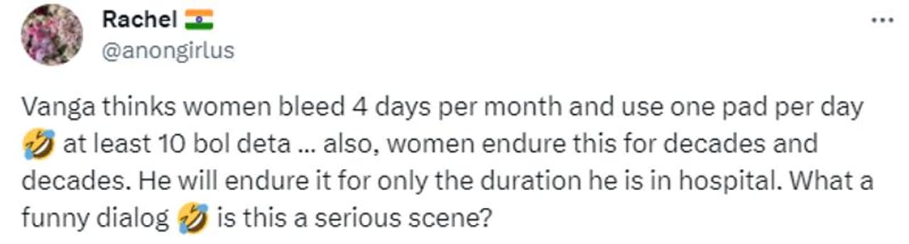 ഉള്ളടക്കത്തിലെ സ്ത്രീവിരുദ്ധതയുടെ പേരില് വിമര്ശനം നേരിട്ട ചിത്രങ്ങളായിരുന്നു തെലുങ്കില് വന് വിജയം നേടിയ അര്ജുന് റെഡ്ഡിയും അതിന്റെ ഹിന്ദി റീമേക്ക് ആയ കബീര് സിംഗും. സമാനമായ വിമര്ശനങ്ങളാണ് അനിമലിനെതിരെയും പ്രധാനമായി ഉയരുന്നത്. ചിത്രത്തിലെ പ്രകടമായ സ്ത്രീവിരുദ്ധതയുടെ ഏറ്റവും വലിയ തെളിവായി വിമര്ശകര് ഉയര്ത്തിക്കാട്ടുന്നത് രണ്ബീര് കപൂര് അവതരിപ്പിച്ച നായക കഥാപാത്രത്തിന്റെ ഒരു സംഭാഷണമാണ്. നായിക രശ്മിക മന്ദാനയോട് രണ്ബീര് പറയുന്ന ഡയലോഗ് ആണിത്. മാസത്തില് നാല് തവണ പാഡ് മാറ്റുന്ന നീ അതിന്റെ പേരില് ഡ്രാമ സൃഷ്ടിക്കുകയാണ്. ഇവിടെ ഞാന് 50 എണ്ണമാണ് ഒരു ദിവസം മാറ്റുന്നത്, എന്നാണ് നായകന് ഭാര്യയോട് പറയുന്നത്. ഭാര്യയുടെ ആര്ത്തവകാലത്തെ തന്റെ ആശുപത്രിവാസവുമായി താരതമ്യപ്പെടുത്തിയുള്ളതാണ് ഈ ഡയലോഗ്.