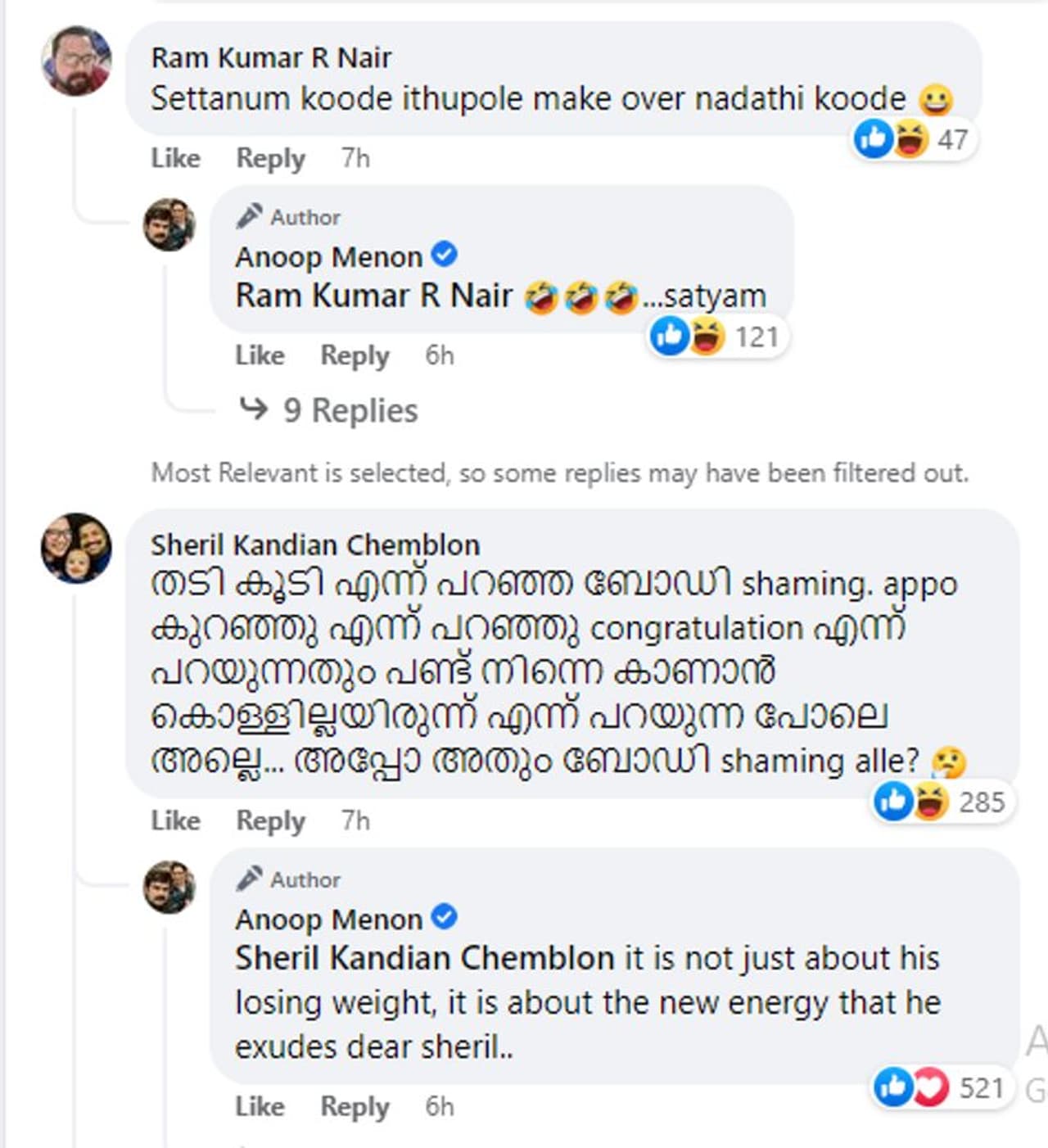 'തടി കൂടി എന്ന് പറഞ്ഞ ബോഡി ഷെയ്മിംഗ്. അപ്പോൾ കുറഞ്ഞു എന്ന് പറഞ്ഞു congratulation എന്ന് പറയുന്നതും പണ്ട് നിന്നെ കാണാൻ കൊള്ളില്ലയിരുന്ന് എന്ന് പറയുന്ന പോലെ അല്ലെ... അപ്പോ അതും ബോഡി shaming alle?' എന്നായിരുന്നു ഒരാളുടെ കമന്റ്. 'ഈ പോസ്റ്റ് ഒരിക്കലും നിവിൻ ഭാരം കുറച്ചതിനെ പറ്റി മാത്രമല്ല, അദ്ദേഹത്തിന്റെ പുതിയ ഊർജ്ജത്തെക്കുറിച്ച് കൂടിയാണ്', എന്നായിരുന്നു അനൂപ് മേനോന്റെ മറുപടി.