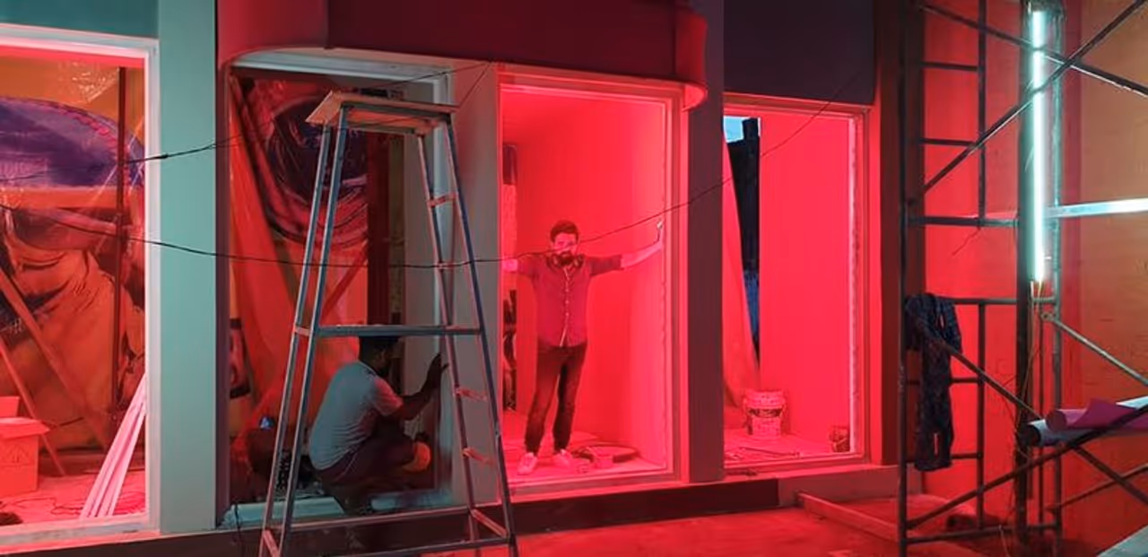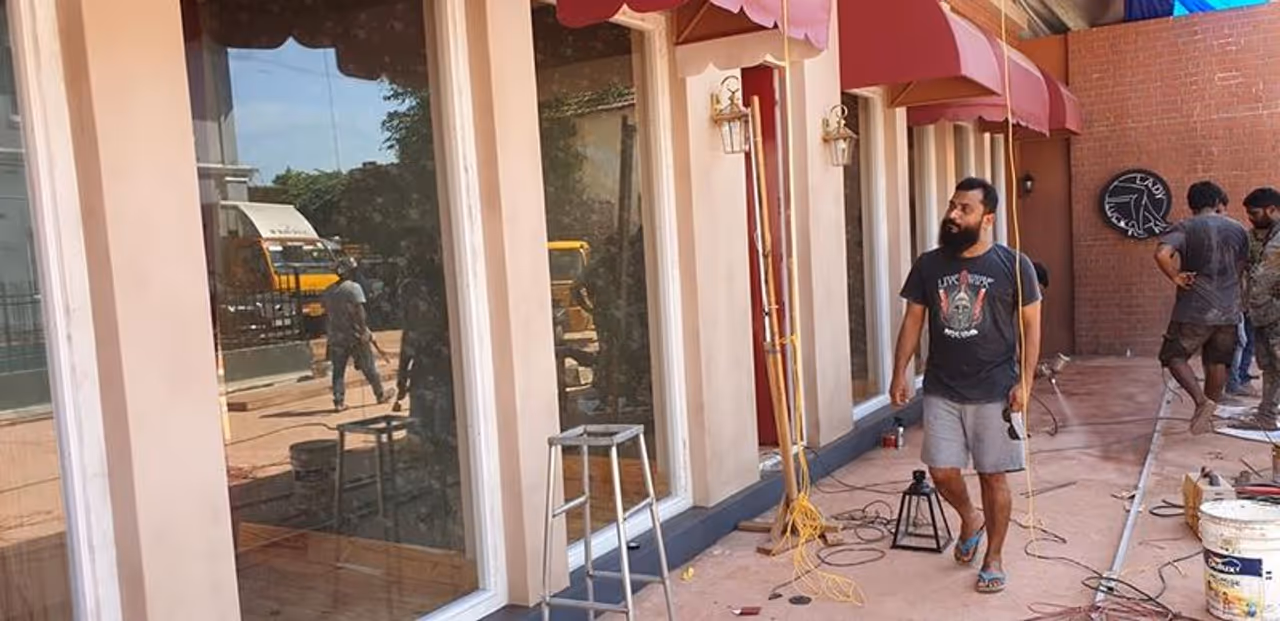 ആംസ്റ്റര്ഡാമിലെ റെഡ് ഡിസ്ട്രിക്റ്റില് സിനിമാ ചിത്രീകരണത്തിന് അനുമതിയില്ലാത്തതിനാല് അവിടേയ്ക്കുള്ള എന്ട്രി മാത്രമാണ് യഥാര്ഥ ലൊക്കേഷനില് ഷൂട്ട് ചെയ്തത്. ആ ഫുട്ടേജ് നോക്കി മനസിലാക്കിയതിനുശേഷം ഫോര്ട്ട് കൊച്ചിയില് അജയന്റെയും ടീമിന്റെയും നേതൃത്വത്തില് സെറ്റ് തയ്യാറാക്കുകയായിരുന്നു. ക്ലൈമാക്സ് സൂക്വന്സ് പൂര്ത്തിയാക്കിയത് ഇവിടെയാണ്. മഴ വകവെക്കാതെ രണ്ടാഴ്ചയോളം എടുത്താണ് സെറ്റിന്റെ നിര്മ്മാണം പൂര്ത്തിയാക്കിയതെന്നും അജയന് ചാലിശ്ശേരി പറയുന്നു. സോഷ്യല് മീഡിയയിലൂടെ സെറ്റിന്റെ വിവിധ നിര്മ്മാണ ഘട്ടങ്ങളും അദ്ദേഹം പങ്കുവച്ചിട്ടുണ്ട്.