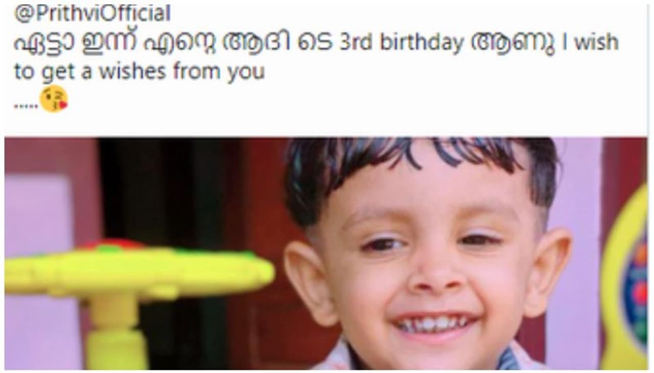 സാദിഖ് മൻസൂര് എന്ന ആരാധകൻ പൃഥ്വിരാജിനോട് അഭ്യര്ഥനയുമായി രംഗത്ത് എത്തുകയായിരുന്നു. ഏട്ടാ, ഇന്ന് എന്റെ മകൻ ആദിയുടെ മൂന്നാം ജന്മദിനമാണ്, താങ്കളില് നിന്ന് ആശംസ ലഭിക്കണമെന്നുണ്ട് എന്നായിരുന്നു അഭ്യര്ഥന. ആശംസയുമായി പൃഥ്വിരാജ് രംഗത്ത് എത്തുകയും ചെയ്തു. സന്തോഷകരമായ ജന്മദിന ആശംസകള് ആദി, മനോഹരമായ ഒരു വര്ഷമുണ്ടാകട്ടെ, മാതാപിതാക്കള്ക്ക് അഭിമാനമായി മാറട്ടെയെന്നുമായിരുന്നു പൃഥ്വിരാജ് എഴുതിയത്. പൃഥ്വിരാജ് ആദിയുടെ ഫോട്ടോയും ഷെയര് ചെയ്തിട്ടുണ്ട്. എന്തായാലും ആരാധകന്റെ അഭ്യര്ഥന അംഗീകരിച്ചതിന് പൃഥ്വിരാജിനെ അഭിനന്ദിക്കുകയാണ് മറ്റുള്ളഴര്.