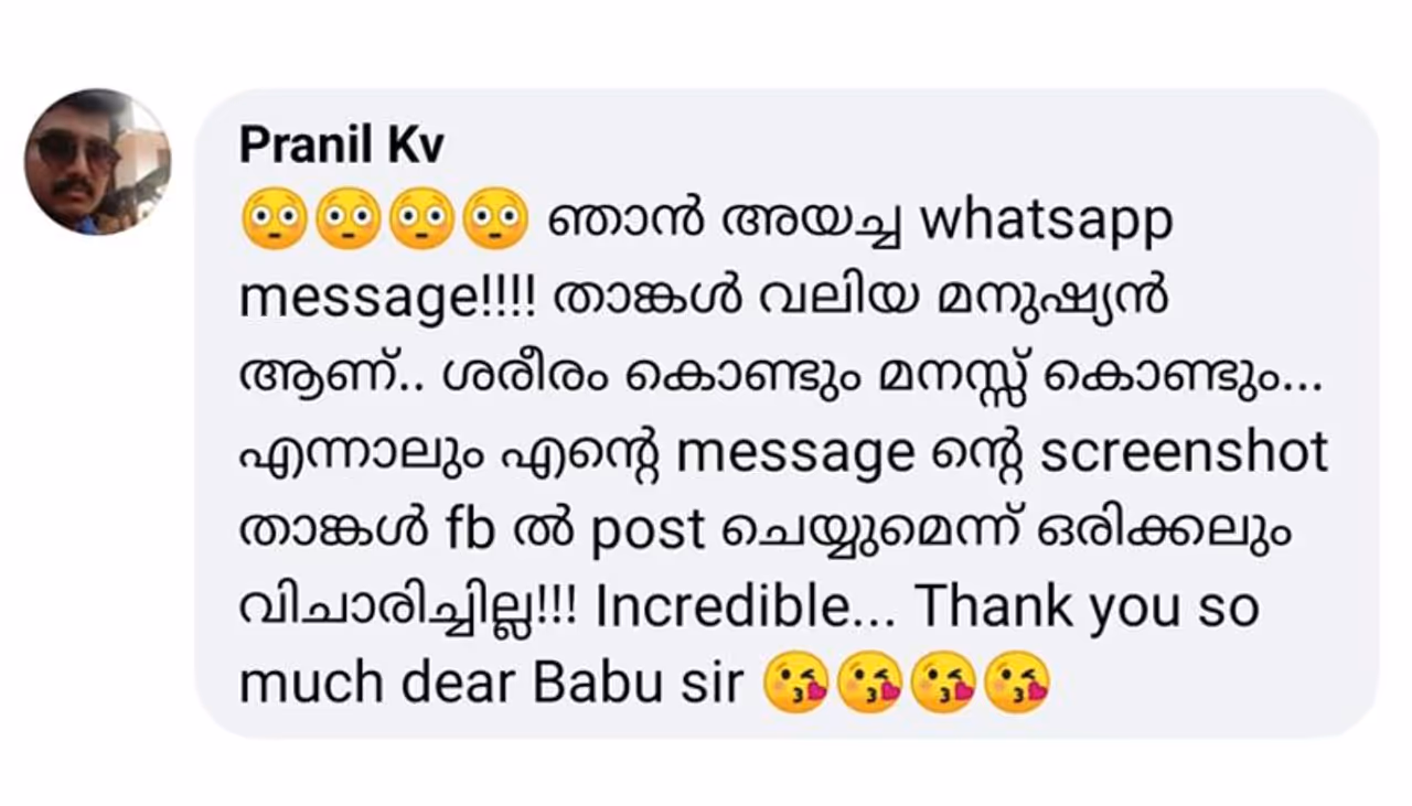 ഈ മെസേജിന് മറുപടി കിട്ടുമെന്ന് പ്രണിൽ സ്വപ്നത്തിൽ പോലും ചിന്തിച്ചിരുന്നില്ല. അതിനിടെ യാദൃശ്ചികമായി ഫേസ് ബുക്ക് എടുത്ത് നോക്കിയപ്പോഴാണ് തന്റെ വാട്സ് ആപ്പ് മെസേജിന്റെ സ്ക്രീൻ ഷോട്ട് ബാബു ആന്റണിയുടെ പേജിൽ കാണുന്നത്. കാലത്തിനും സമയത്തിനും അപ്പുറമായ സ്നേഹമാണ് ഇതെന്നുകൂടി സ്ക്രീൻ ഷോട്ടിനൊപ്പമെഴുതി ബാബു ആന്റണി. ഒരിക്കൽ നേരിട്ട് കാണാമെന്നും താരത്തിന്റെ ഉറപ്പ്. ആ ദിവസത്തിനായാണ് ഇനി പ്രണിലിന്റെ കാത്തിരിപ്പ്. പ്രണിലിനെ പോലെ ബാബു ആന്റണിയെ കാണാൻ ഒട്ടേറെ ആരാധകരാണ് കാത്തിരിക്കുന്നത്. താരത്തെ ഒന്ന് കാണണം എന്ന ആവശ്യവുമായി ഒട്ടേറെ കമന്റുകളാണ് ബാബു ആന്റണിയുടെ ഫേസ്ബുക്ക് പോസ്റ്റിന് ലഭിച്ചുകൊണ്ടിരിക്കുന്നതും.
