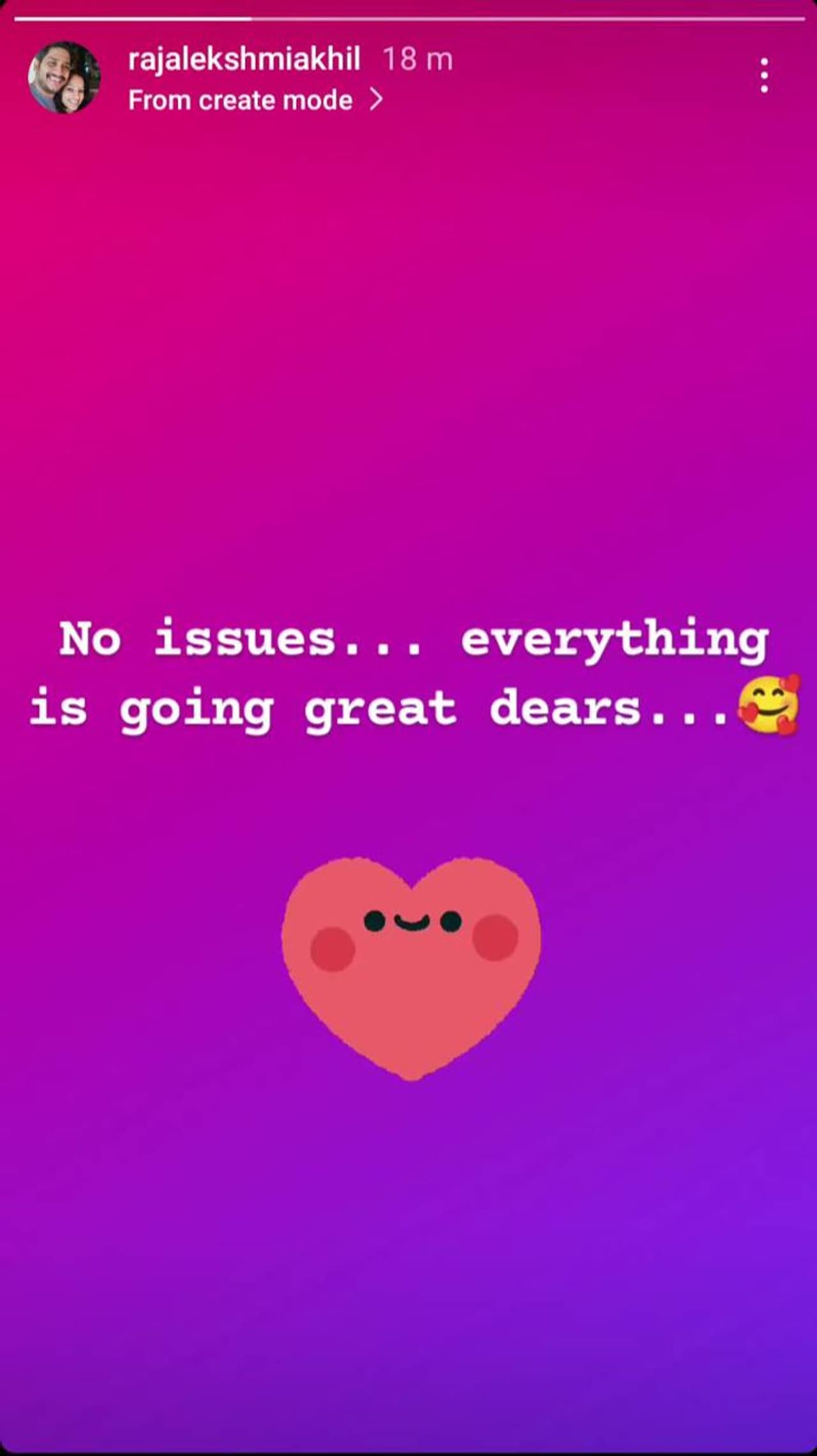 ഒരു വിഷയവും ഇല്ല, എല്ലാം നന്നായി പോകുന്നു പ്രിയപ്പെട്ടവരെ എന്നാണ് ഇംഗ്ലീഷില് ഇട്ട ഈ സ്റ്റാറ്റസ് പറയുന്നത്. ഇതോടെ അഖില് ആരാധകര് ആഹ്ളാദത്തിലാണ്. എന്നാല് എന്താണ് ബിഗ്ബോസ് ഷോയില് സംഭവിക്കുക എന്ന ആശങ്ക ഇപ്പോഴും ഉണ്ട്. അധികം വൈകാതെ 9 മണിക്ക് ഷോയുടെ മോഹന്ലാല് അവതരിപ്പിക്കുന്ന നിര്ണ്ണായക എപ്പിസോഡ് ടെലികാസ്റ്റ് ചെയ്യും.