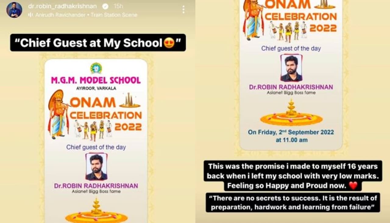 താൻ പഠിച്ച സ്കൂളിലേക്ക് ചീഫ് ഗസ്റ്റായി ക്ഷണിച്ചതിന്റെ വിവരം പങ്കുവച്ച് കൊണ്ടുള്ള പോസ്റ്റാണ് റോബിൻ പങ്കുവച്ചത്. 'ഇതാണ് ഞാൻ പതിനാറ് വർഷങ്ങൾക്ക് മുമ്പ് എനിക്ക് തന്നെ നൽകിയ പ്രോമിസ്. മാർക്ക് കുറഞ്ഞതിന്റെ പേരിൽ ഈ സ്കൂളിൽ നിന്നും പോകേണ്ടി വന്ന ഞാൻ ഈ വരുന്ന സെപ്റ്റംബർ 2ന് നടക്കുന്ന ഓണാഘോഷ പരിപാടിയിൽ ചീഫ് ഗെസ്റ്റായി അതേ സ്കൂളിലേക്ക് പോകാൻ പോകുന്നു. സക്സസിന് മറ്റൊരു സീക്രട്ടും ഇല്ല. തോൽവികളിൽ നിന്നും പഠിക്കുക, കഠിനാധ്വാനം ചെയ്യുക, തയ്യാറെടുപ്പുകൾ നടത്തുക എന്നത് മാത്രമാണ് വഴി', എന്നാണ് റോബിൻ കുറിച്ചത്.