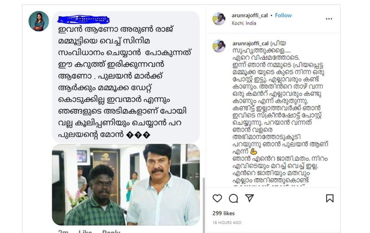 നടൻ മമ്മൂട്ടിക്ക് ഒപ്പമുള്ള ഫോട്ടോ പങ്കുവച്ചതിന് പിന്നാലെ വന്ന ജാതി അധിക്ഷേപ കമന്റിന് മറുപടിയുമായി സംവിധായകൻ അരുൺരാജ്. കഴിഞ്ഞ ദിവസം ആണ് അരുൺ 'ബാക്കി പുറകെ', എന്ന തലക്കെട്ടിൽ ഫോട്ടോ ഷെയർ ചെയ്തത്. ഈ പോസ്റ്റിന് താഴെയാണ് അധിക്ഷേപ കമന്റ് വന്നത്.