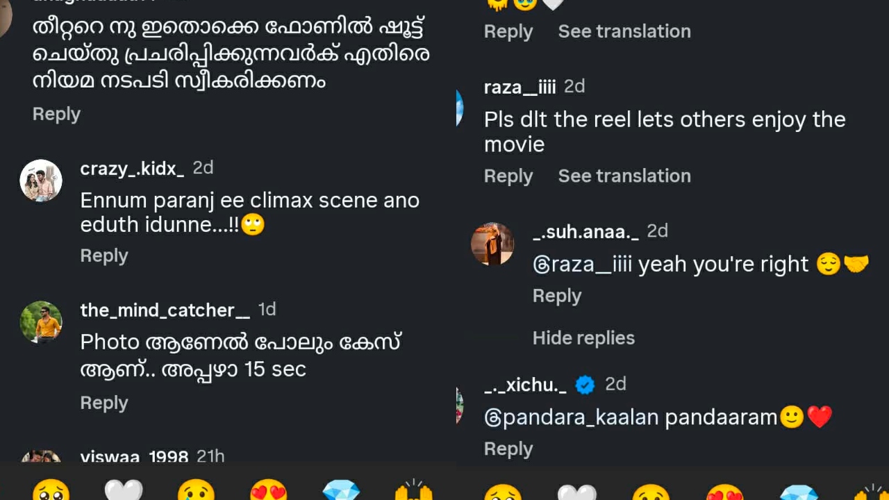 തിയേറ്ററുകളിൽ മികച്ച വിജയം നേടി മുന്നേറുന്ന 'വാഴ 2' എന്ന സിനിമയുടെ പ്രധാന രംഗങ്ങൾ മൊബൈലിൽ പകർത്തി ഇൻസ്റ്റാഗ്രാമിൽ വ്യാപകമായി പ്രചരിപ്പിക്കുന്നു. ഉടന് നിയമനടപടി സ്വീകരിക്കണമെന്നാണ് പ്രേക്ഷകർ ഒന്നടങ്കം ആവശ്യപ്പെടുന്നത്.