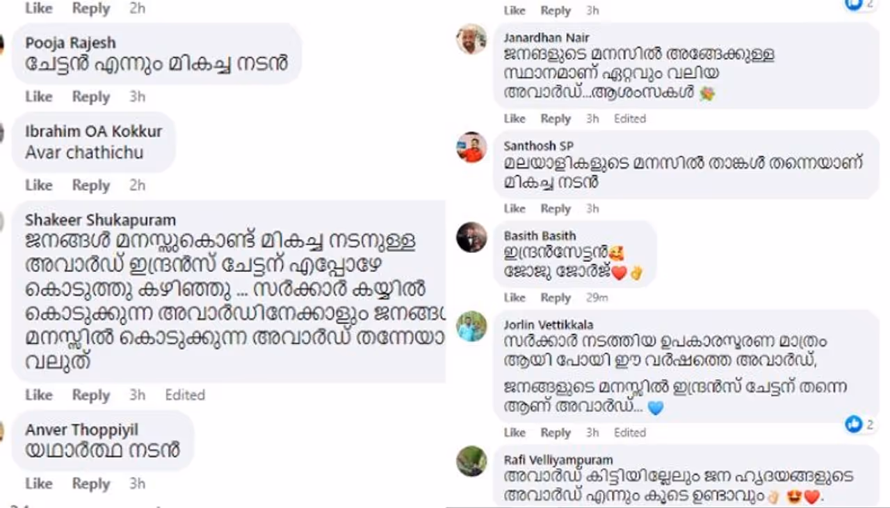 'ജനഹൃദയങ്ങളിലെ മികച്ച നടന് ഇന്ദ്രൻ' എന്നാണ് പ്രേക്ഷകർ കുറിക്കുന്നത്. 'ഞങ്ങളുടെ അവാർഡ് ഇന്ദ്രൻസ് ചേട്ടന്,