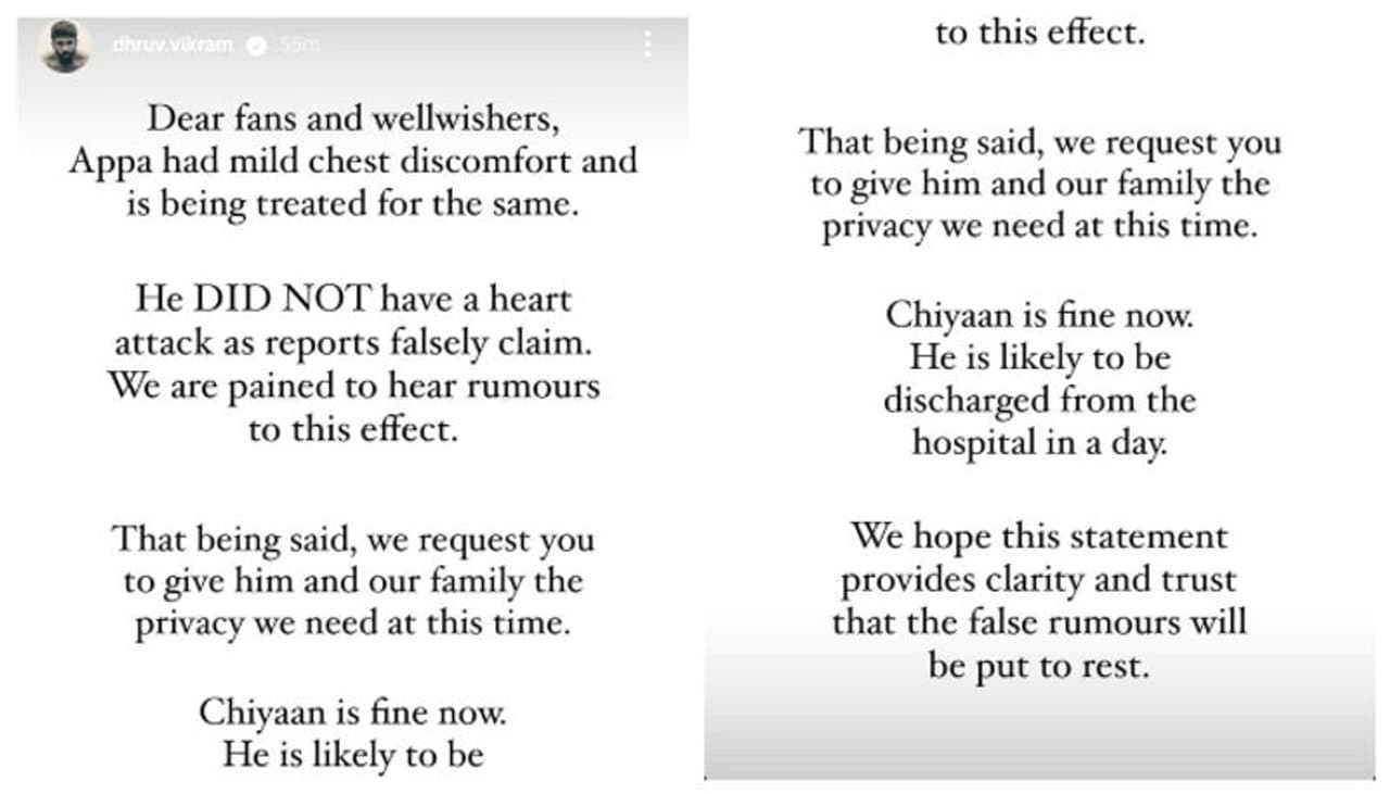 ചിയാന് ഇപ്പോള് സുഖമായിരിക്കുന്നു. ഈ സമയത്ത് കുടുംബത്തിന് ആവശ്യമായ സ്വകാര്യത ആവശ്യമാണ്. ഒരു ദിവസത്തിനകം അദ്ദേഹം ആശുപത്രിയില് നിന്ന് ഡിസ്ചാര്ജ് ആകാനാണ് സാധ്യതയെന്നും ധ്രുവ് പറഞ്ഞു. വിക്രമിനെ ആശുപത്രിയില് പ്രവേശിപ്പിച്ചെന്ന വാര്ത്ത പുറത്തുവന്നതോടെ നിരവധിപ്പേരാണ് സമൂഹമാധ്യമങ്ങളിലൂടെ അദ്ദേഹത്തിന് ആയുരാരോഗ്യസൗഖ്യം നേരുന്നത്. 'ഗെറ്റ് വെൽ സൂൺ ചിയാൻ' എന്ന ഹാഷ് ടാഗ് ഇപ്പോൾ ട്വിറ്ററിൽ ട്രെന്റിംഗ് ആണ്.