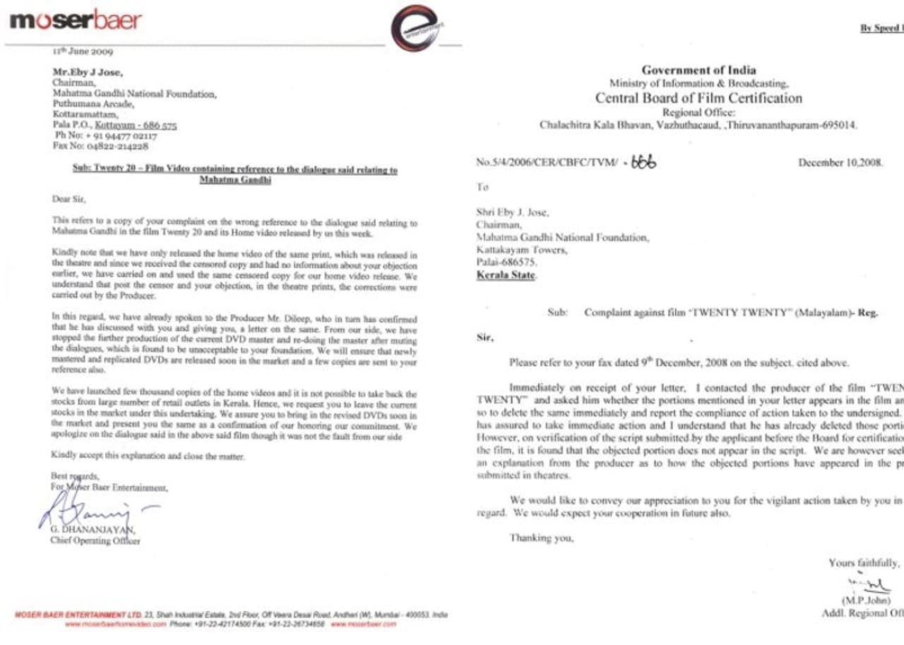 ഇന്ത്യയ്ക്കു സ്വാതന്ത്ര്യം ലഭിച്ചത് ഗാന്ധിജി ഉപ്പു തിന്നും വെള്ളം കുടിച്ചും തെണ്ടി നടന്നുമാണെന്നായിരുന്നു ട്വന്റി 20യിലെ പരാമര്ശം. ഇതിനെതിരെ പാലായിലെ മഹാത്മാഗാന്ധി നാഷണല് ഫൗണ്ടേഷന് ചെയര്മാന് എബി ജെ ജോസ് സെന്സര് ബോര്ഡിന് പരാതി നല്കുകയായിരുന്നു. പിന്നാലെ വിവാദ രംഗം ചിത്രത്തില് നിന്ന് നീക്കിയെങ്കിലും ചിത്രത്തിന്റെ നിര്മ്മാതാവ് കൂടിയായ ദിലീപ് ഖേദപ്രകടനം നടത്താന് ആദ്യം തയ്യാറായില്ല. പിന്നീട് സിനിമയുടെ വിസിഡി പുറത്തിറങ്ങിയപ്പോള് വിവാദ ഡയലോഗ് അതില് ഉള്പ്പെടുത്തുകയും ചെയ്തിരുന്നു. ഇതിനെതിരെയും മഹാത്മാഗാന്ധി നാഷണൽ ഫൗണേഷൻ പ്രതിഷേധം ഉയര്ത്തിയതോടെ ദിലീപും വിഡിസി നിര്മ്മാതാക്കളായ മോസര്ബെയര് കമ്പനിയും പരസ്യമായി ഖേദം പ്രകടിപ്പിക്കുകയായിരുന്നെന്ന് ചെയര്മാന് എബി ജെ ജോസ് ഓര്ക്കുന്നു. സിനിമയിൽ നിന്നും വെട്ടിമാറ്റിയ ഭാഗം സാങ്കേതിക പിഴവുമൂലം വിസിഡിയില് ഉള്പ്പെട്ടതാണെന്നായിരുന്നു അവര് അറിയിച്ചത്.