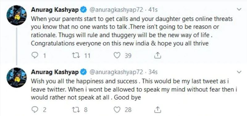 എപ്പോഴാണോ നിങ്ങളുടെ മാതാപിതാക്കള്ക്ക് ഭീഷണികോളുകള് ലഭിക്കുന്നത്, മകള്ക്ക് ഓണ്ലൈന് വഴി ഭീഷണിയുണ്ടാവുന്നത്, ആ സമയത്താണ് സംസാരിക്കാന് പാടില്ലെന്ന് നിങ്ങള്ക്കറിയാന് സാധിക്കുക. കൊള്ളക്കാര് ഭരിക്കുന്ന ഈ പുതിയ ഇന്ത്യയിലെ എല്ലാവര്ക്കും അഭിനന്ദനങ്ങളെന്ന് നേരത്തെ കശ്യപ് ട്വീറ്റ് ചെയ്തിരുന്നു.മാതാപിതാക്കള്ക്ക് നേരെ ആക്രമണമുണ്ടായതിന് പിന്നാലെയാണ് ട്വിറ്ററില്നിന്നും കശ്യപ് പൂര്ണമായും പിന്മാറിയത്.