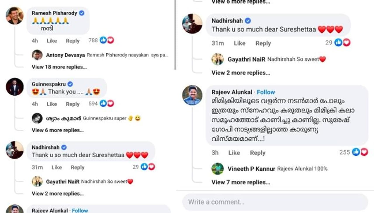 മിമിക്രി ആർട്ടിസ്റ്റ് അസോസിയേഷനാണ്(എംഎഎ) സുരേഷ് ഗോപി തുക കൈമാറിയത്. നാദിർഷക്കാണ് ചെക്ക് കൈമാറിയത്. ഇതിന്റെ ചെക്കിന്റെ ഫോട്ടോയും സുരേഷ് ഗോപി പങ്കുവച്ചു. പിന്നാലെ നിരവധി പേരാണ് നടന് നന്ദി അറിയിച്ചും ആശംസ അറിയിച്ചും രംഗത്തെത്തുന്നത്. താരങ്ങൾ ഉൾപ്പടെയുള്ളവർ സുരേഷ് ഗോപിക്ക് നന്ദി അറിയിച്ചു.