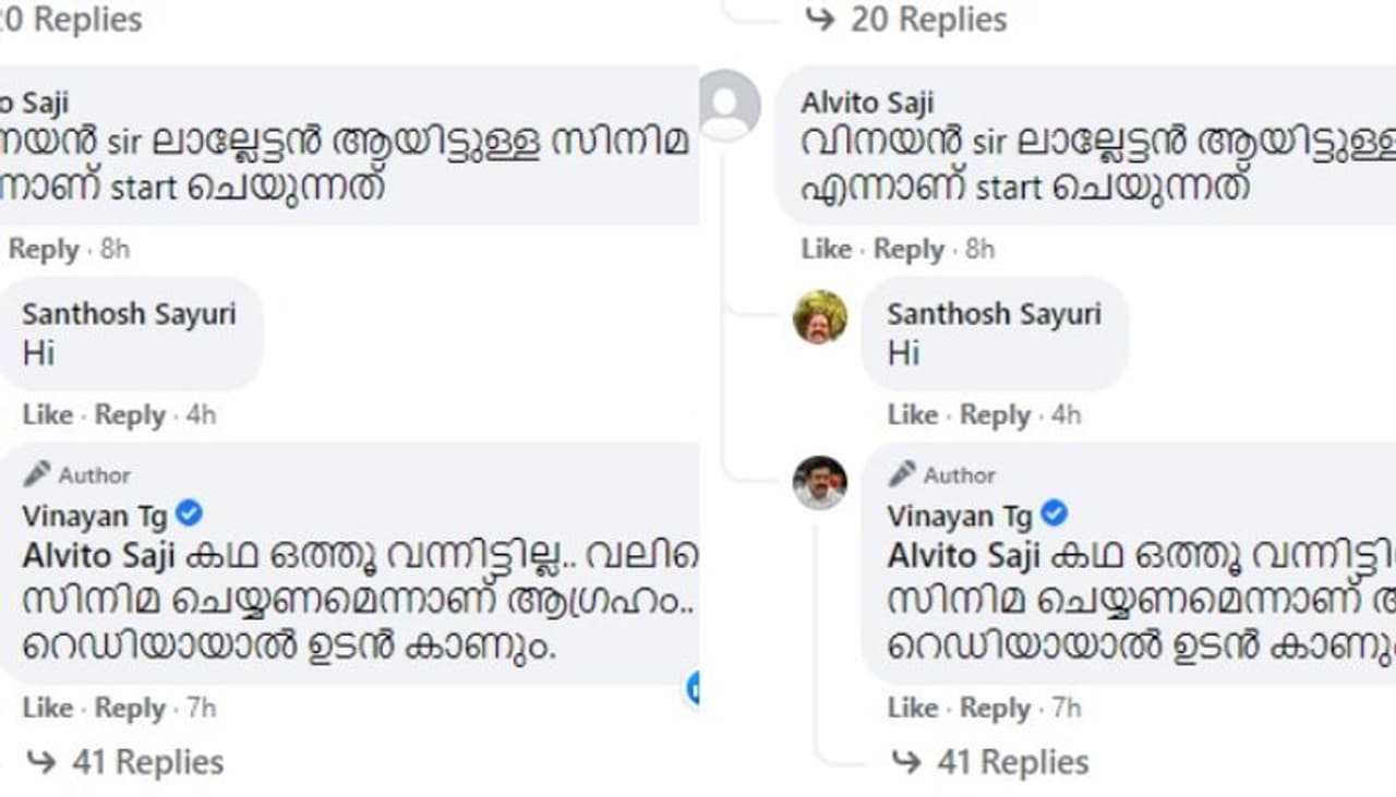 മോഹൻലാലുമായുള്ള ചിത്രം എന്ന് തുടങ്ങുമെന്നായിരുന്നു ആരാധകന്റെ ചോദ്യം. ‘കഥ ഒത്തു വന്നിട്ടില്ല.. വലിയൊരു സിനിമ ചെയ്യണമെന്നാണ് ആഗ്രഹം.. കഥ റെഡിയായാല് ഉടന് കാണും’ എന്നായിരുന്നു വിനയന്റെ മറുപടി. തന്റെ പുതിയ ചിത്രമായ പത്തൊമ്പതാം നൂറ്റാണ്ടിന്റെ ക്യാരക്ടർ പോസ്റ്റർ അദ്ദേഹം കഴിഞ്ഞ ദിവസം പങ്കുവച്ചിരുന്നു. ഇതിന് താഴെ ആയിരുന്നു ആരാധകരന്റെ ചോദ്യം.