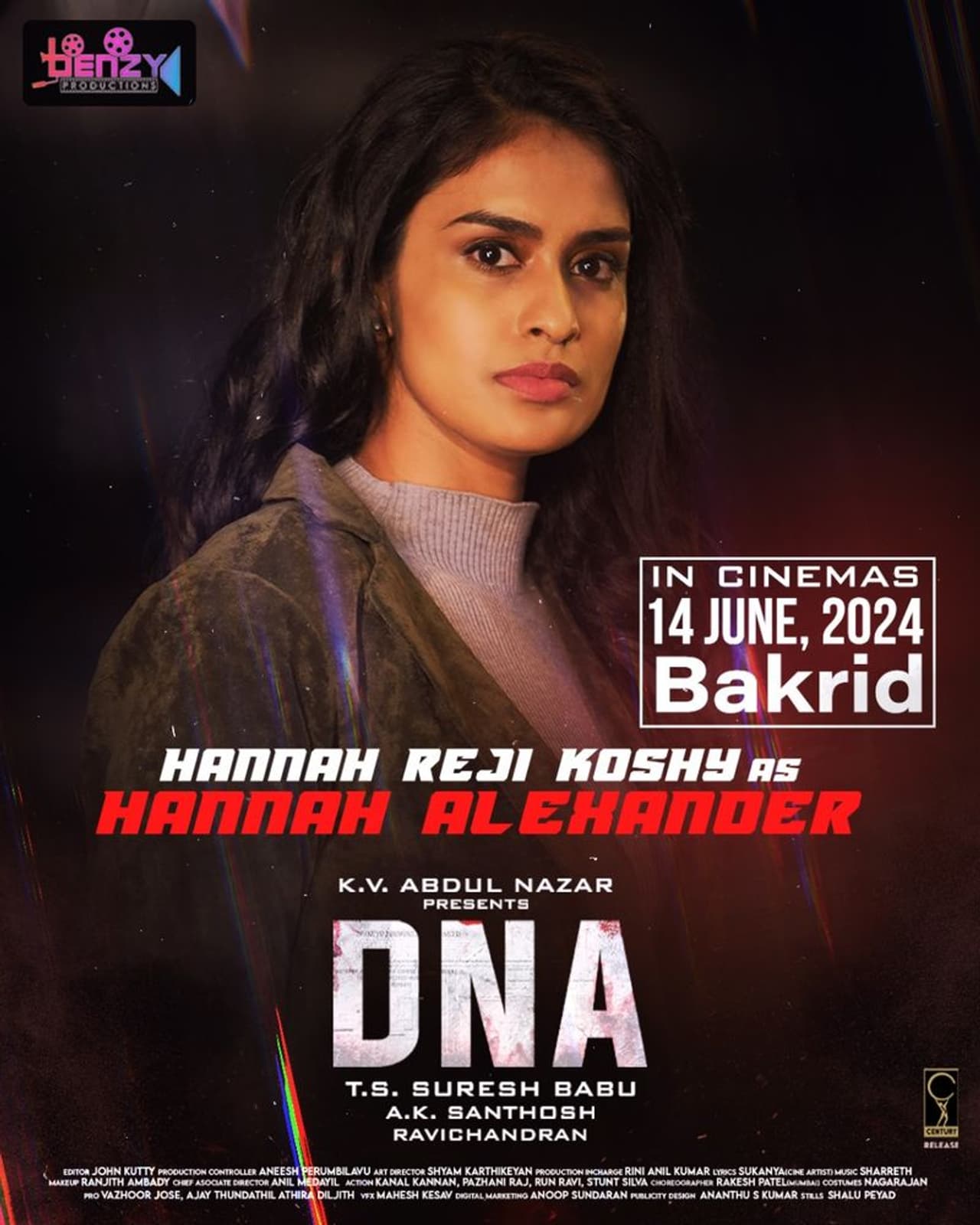 ഹന്നാ അലക്സാണ്ടര് എന്ന കഥാപാത്രത്തെയാണ് നടി ഡിഎന്എയില് അവതരിപ്പിക്കുന്നത്. യുവ നടൻ അഷ്കർ സൗദാനാണ് ചിത്രത്തിലെ നായകകഥാപാത്രത്തെ അവതരിപ്പിക്കുന്നത്. ബെൻസി പ്രൊഡക്ഷൻസിന്റെ ബാനറിൽ കെ.വി.അബ്ദുൾ നാസ്സർ നിർമ്മിക്കുന്ന ഡിഎൻഎ ജൂൺ പതിനാലിന് കേരളത്തിനകത്തും പുറത്തും പ്രദർശനത്തിനെത്തും. എ.കെ. സന്തോഷിന്റെ തിരക്കഥയിൽ പൂർണ്ണമായും, ഇൻവസ്റ്റിഗേറ്റീവ്- ആക്ഷൻ-മൂഡിലുള്ള ഈ ചിത്രത്തിൽ മലയാളത്തിലെ മികച്ച ടെക്നീഷ്യന്സും അണിനിരക്കുന്നുണ്ട്. ആക്ഷൻ രംഗങ്ങൾ ഈ ചിത്രത്തിൻ്റെ ഏറെ ആകർഷകമായ ഒരു ഘടകമാണ്.