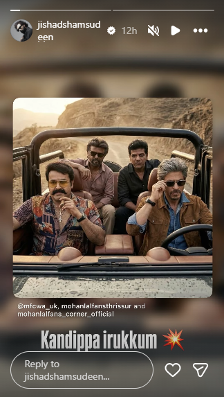 മോഹൻലാലും രജനിയും ഷാരുഖ് ഖാനും ശിവരാജ് കുമാറും ഉള്ള ഒരു എ.ഐ ചിത്രമാണ് ജിഷാദ് തന്റെ ഇൻസ്റ്റാഗ്രാം സ്റ്റോറിൽ പങ്കുവച്ചിരിക്കുന്നത്. എന്തായാലും ജയിലർ രണ്ടാം ഭാഗത്തിൽ മുത്തുവേൽ പാണ്ഡ്യാനൊപ്പം മോഹൻലാലും ഷാരുഖും ഒന്നിക്കും എന്ന് തന്നെയാണ് പ്രേക്ഷകർ പ്രതീക്ഷിക്കുന്നത്. ആദ്യ ഭാഗത്തിലെ പ്രതിനായകനായി എത്തിയ വിനായകൻ രണ്ടാം ഭാഗത്തിലുമുണ്ടെന്ന് നേരത്തെ താരം പറഞ്ഞിരുന്നു. അതുപോലെ തന്നെ വിജയ് സേതുപതിയും ചിത്രത്തിൽ ഒരു പ്രധാന വേഷത്തിലെത്തുന്നുണ്ട്.