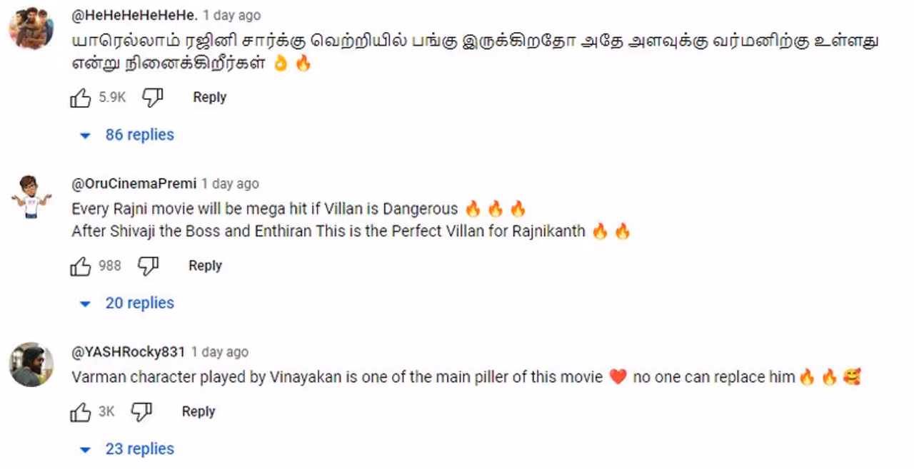 വിനായകന്റെ പ്രകടനത്തെ പുകഴ്ത്തിക്കൊണ്ടുള്ളതാണ് ഇതില് ഓരോ കമന്റും. ജയിലറിന്റെ വിജയത്തില് രജനിയോളം പങ്ക് വിനായകനുമുണ്ടെന്ന് ആരൊക്കെ കരുതുന്നുവെന്ന തമിഴിലുള്ള കമന്റിന് ആറായിരത്തോളം ലൈക്കുകളാണ് ലഭിച്ചിരിക്കുന്നത്. വില്ലന് അപകടകാരി ആവുമ്പോഴാണ് രജനി ചിത്രങ്ങള് മെഗാഹിറ്റുകള് ആവുന്നത്. ശിവാജിക്കും എന്തിരനും ശേഷം ഇതാണ് രജനികാന്തിന് ലഭിച്ച പെര്ഫെക്റ്റ് വില്ലന്, എന്നാണ് മറ്റൊരു കമന്റ്. ജയിലറിന്റെ ആത്മാവ് വര്മനാണ്, ഈ പ്രകടനത്തിന് വിനായകന് അവാര്ഡ് ലഭിക്കണം ഇങ്ങനെ പോകുന്ന കമന്റുകള്ക്കിടയില് ആരാധകര് മറ്റൊരു കാര്യം കൂടി ആവശ്യപ്പെടുന്നുണ്ട്. പ്രതിഫലത്തിന് പുറമെ നിര്മ്മാതാവ് വിനായകനും സമ്മാനം നല്കണം എന്നതാണ് അത്.