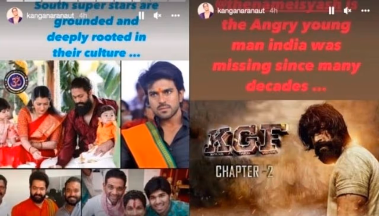 രാം ചരൺ, അല്ലു അർജുൻ, എൻടിആർ ജൂനിയർ, യാഷ് എന്നിവരുടെ ചിത്രങ്ങൾ പങ്കുവച്ച്, ദക്ഷിണേന്ത്യയിലെ സൂപ്പർ താരങ്ങൾ അവരുടെ സംസ്കാരത്തിൽ അടിയുറച്ച് വിശ്വസിക്കുന്നവരാണെന്നും അതാണ് പ്രേക്ഷകരെ കൂടുതൽ ആകർഷിക്കുന്നതെന്നും കങ്കണ മറ്റൊരു സ്റ്റോറിയിൽ കുറിച്ചു.