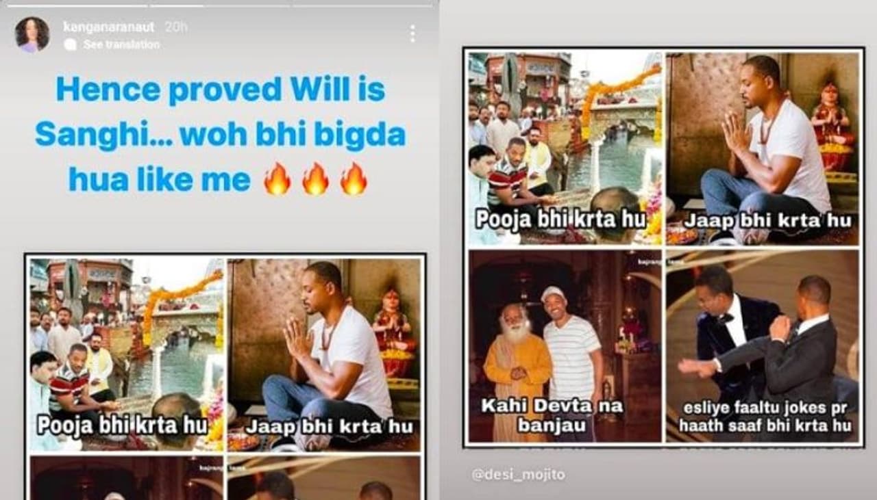 വിൽ സ്മിത്തിന്റെ നാല് ചിത്രങ്ങൾ പങ്കുവച്ചുകൊണ്ടായിരുന്നു കങ്കണയുടെ പ്രതികരണം. സ്മിത് ക്ഷേത്രത്തില് പ്രാര്ത്ഥിക്കുന്നതിന്റെയും സദ്ഗുരുവിനൊപ്പം നില്ക്കുന്നതിന്റെയും ചിത്രങ്ങളാണ് കങ്കണ പങ്കുവെച്ചത്. ഞാനും പ്രാര്ത്ഥിക്കാറും സ്തുതി ഗീതങ്ങള് ചൊല്ലാറുമുണ്ടെന്നും എന്ന് വെച്ച് ഞാന് ദൈവമാവുന്നില്ലെന്നും അനാവശ്യ തമാശകള് പറയുന്നവരെ മുഖത്തടിക്കാറുണ്ടെന്നും കങ്കണ കുറിക്കുന്നു.