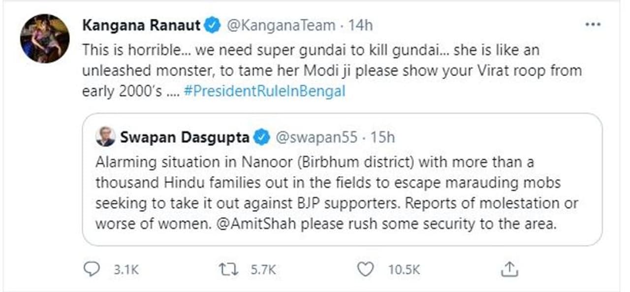 നിയമസഭാ തെരഞ്ഞെടുപ്പ് ഫലം പുറത്തുവന്നതിനു ശേഷം ബംഗാളില് അരങ്ങേറുന്ന അക്രമസംഭവങ്ങളില് ഒരു മതവിഭാഗത്തെ ലക്ഷ്യം വെക്കുന്നുണ്ടെന്ന് ചൂണ്ടിക്കാട്ടി ബംഗാളില് നിന്നുള്ള ബിജെപി എംപി സ്വപന്ദാസ് ഗുപ്ത ട്വീറ്റ് ചെയ്തിരുന്നു. ബിര്ഭം ജില്ലയിലെ നാനൂരില് സ്ഥിതി അപകടകരമാണെന്നും ബിജെപി പ്രവര്ത്തകരെ ലക്ഷ്യം വച്ച് ഇറങ്ങിയിരിക്കുന്ന അക്രമികളില് നിന്നും രക്ഷതേടി ആയിരത്തിലധികം കുടുംബങ്ങള് വീടുവിട്ട് ഇറങ്ങിയിരിക്കുകയാണെന്നും ട്വീറ്റില് ഉണ്ടായിരുന്നു. വേണ്ട നടപടി സ്വീകരിക്കാന് ആവശ്യപ്പെട്ട് കേന്ദ്ര ആഭ്യന്തരമന്ത്രി അമിത് ഷായെ ടാഗ് ചെയ്തുകൊണ്ടായിരുന്നു പ്രസ്തുത ട്വീറ്റ്. ഈ ട്വീറ്റ് പങ്കുവച്ചുകൊണ്ട് കങ്കണ കുറിച്ച വരികളാണ് വ്യാപക വിമര്ശനത്തിന് ഇടയാക്കിയത്.