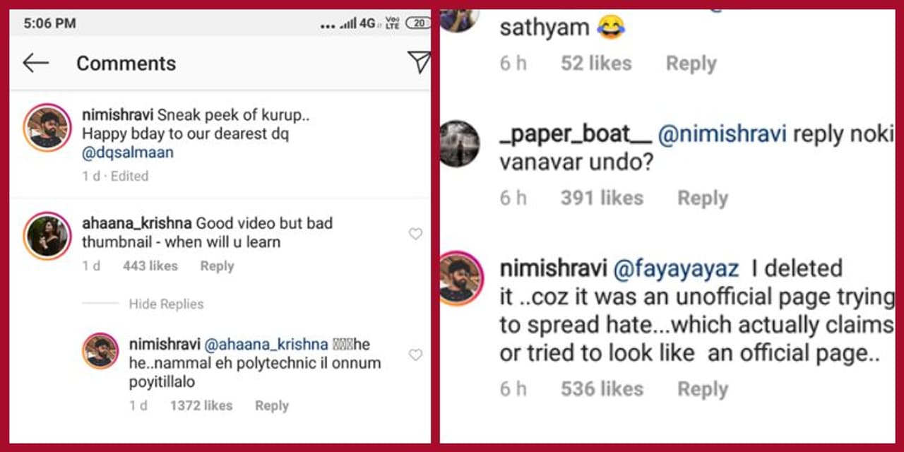 ദുല്ഖര് സല്മാന്റേതായി പ്രഖ്യാപിക്കപ്പെട്ട സിനിമകളില് പ്രേക്ഷകരില് വലിയ കാത്തിരുപ്പ് സൃഷ്ടിച്ച ചിത്രമാണ് ശ്രീനാഥ് രാജേന്ദ്രന് സംവിധാനം ചെയ്യുന്ന 'കുറുപ്പ്'. ദുല്ഖറിന്റെ അരങ്ങേറ്റചിത്രമായ സെക്കന്റ് ഷോയുടെ സംവിധായകന് ഒരുക്കുന്ന പുതിയ ചിത്രം കുപ്രസിദ്ധ പിടികിട്ടാപ്പുള്ളി സുകുമാരക്കുറുപ്പിന്റെ കഥ പറയുന്ന ചിത്രമാണ്. ദുല്ഖറിന്റെ പിറന്നാള് ദിനമായിരുന്ന ഇന്നലെ ചിത്രത്തിന്റെ സ്നീക്ക് പീക്ക് വീഡിയോ അണിയറപ്രവര്ത്തകര് പുറത്തുവിട്ടിരുന്നു. സിനിമയുമായി ബന്ധപ്പെട്ടവര് തങ്ങളുടെ പല സോഷ്യല് മീഡിയ പ്ലാറ്റ്ഫോമുകളില് വീഡിയോ ഷെയര് ചെയ്ത കൂട്ടത്തില് ചിത്രത്തിന്റെ ഛായാഗ്രാഹകനായ നിമിഷ് രവി തന്റെ ഇന്സ്റ്റഗ്രാം അക്കൗണ്ടിലൂടെയും വീഡിയോ പങ്കുവച്ചിരുന്നു. ഇതിനു ലഭിച്ച സെലിബ്രിറ്റി പ്രതികരണങ്ങളില് ഒന്ന് നടി അഹാന കൃഷ്ണയുടേതായിരുന്നു. വീഡിയോ നന്നായിട്ടുണ്ടെന്നും പക്ഷേ മോശം തമ്പ് നെയില് ആണെന്നുമായിരുന്നു അഹാന കമന്റായി കുറിച്ചത്. ഇനിയെന്നാണ് ഇത് പഠിക്കുകയെന്നും. നിമിഷിന്റെ അടുത്ത സുഹൃത്താണ് അഹാന. അഹാന നായികയായ ലൂക്കയുടെ ഛായാഗ്രാഹകനുമായിരുന്നു അദ്ദേഹം. എന്നാല് അഹാനയുടെ കമന്റിന് താഴെയെത്തിയ ഒരു പ്രതികരണം വൈറല് ആയി. 'കുറുപ്പ് മൂവി ഒഫിഷ്യല്' എന്ന അക്കൗണ്ടില് നിന്നെത്തിയ പ്രതികരണം 'അയിന് നീ ഏതാ?' എന്നായിരുന്നു. ഇത് സിനിമയുടെ ഒഫിഷ്യല് ഇന്സ്റ്റഗ്രാം പേജ് ആണെന്ന് ആളുകള് ധരിച്ചതോടെ കമന്റ് വൈറലായി, ഒപ്പം ട്രോളുമായി. എന്നാല് തങ്ങളുമായി ബന്ധമില്ലാത്ത അക്കൗണ്ടാണ് ഇതെന്ന് വ്യക്തമാക്കി രംഗത്തെത്തിയിരിക്കുകയാണ് 'കുറുപ്പ്' ടീം.