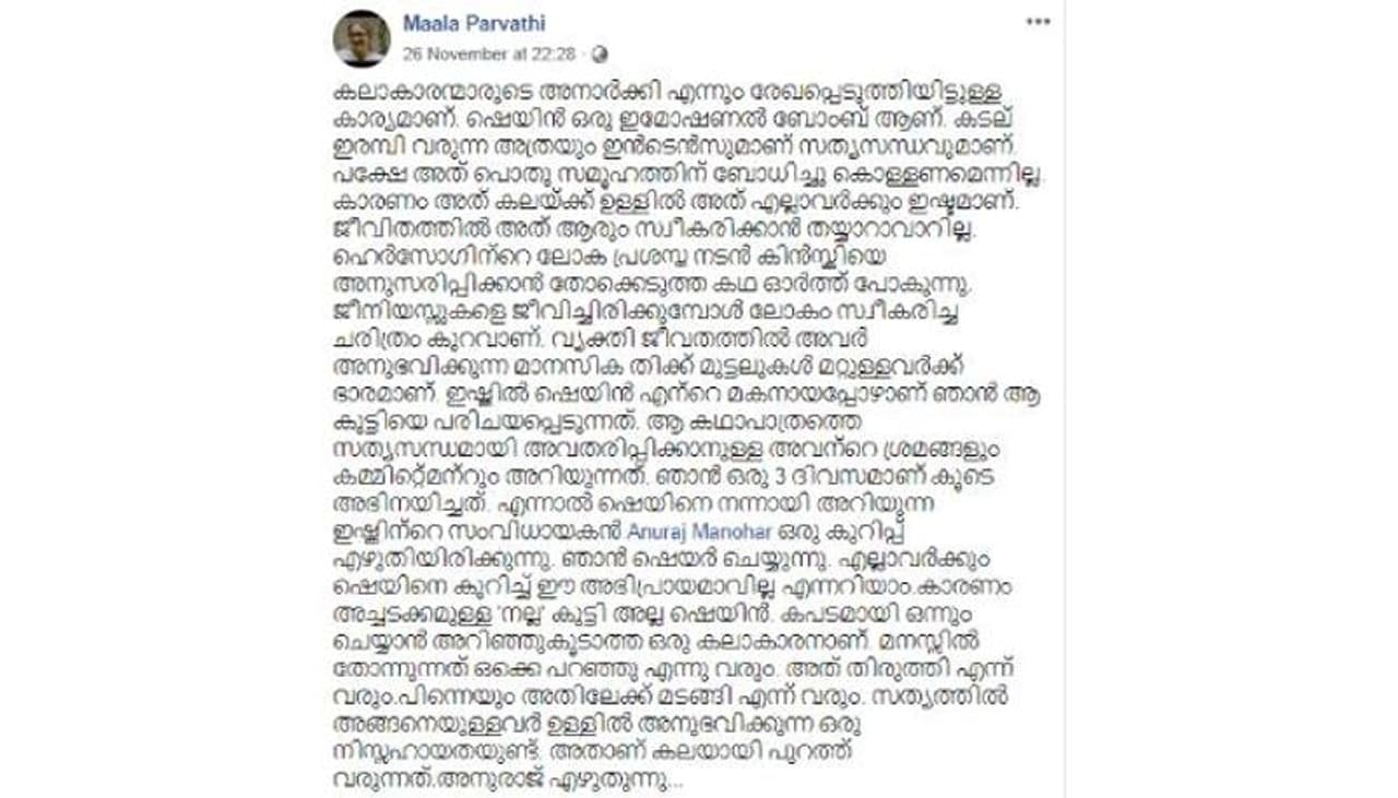യുവനടൻ ഷെയ്ൻ നിഗവുമായി ബന്ധപ്പെട്ട് നടന്നക്കുന്ന വിഷയത്തില് പ്രതികരണവുമായി നടി മാല പാർവതി. കപടമായി ഒന്നും ചെയ്യാൻ അറിഞ്ഞുകൂടാത്ത ഒരു കലാകാരനാണ് ഷെയ്നെന്നും മനസ്സിൽ തോന്നുന്നത് പറയുമെങ്കിലും അത് പിന്നീട് തിരുത്താൻ തയ്യാറാകുന്ന താരമാണ് ആ കുട്ടിയെന്നും മാല പാർവതി പറഞ്ഞു. ഇഷ്ക് സംവിധായകൻ അനുരാജിന്റെ കുറിപ്പ് പങ്കുവച്ചുകൊണ്ടായിരുന്നു നടിയുടെ പ്രതികരണം. ഇഷ്ക് സിനിമയിൽ ഷെയ്ൻ നിഗത്തിന്റെ അമ്മയുടെ കഥാപാത്രത്തെ മാല പാർവതിയായിരുന്നു അവതരിപ്പിച്ചത്.