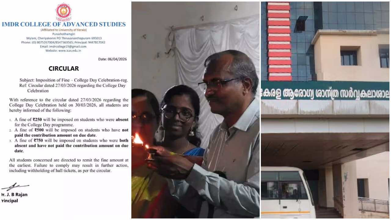 തിരുവനന്തപുരം ഐഎംഡിആർ കോളജ് പ്രിൻസിപ്പൽ കോളജ് ഡേയിൽ പങ്കെടുക്കാത്തവർക്കും സംഭാവന നൽകാത്തവർക്കും പിഴ ചുമത്തി വിചിത്ര സർക്കുലർ പുറത്തിറക്കി. പിഴ അടച്ചില്ലെങ്കിൽ പരീക്ഷാ ഹാൾ ടിക്കറ്റ് നൽകില്ലെന്ന ഭീഷണിയെ തുടർന്ന്, ആരോഗ്യ സർവകലാശാല ഇടപെട്ട് വിശദീകരണം തേടുകയും സർക്കുലർ പിൻവലിക്കാൻ നിർദേശിക്കുകയും ചെയ്തു