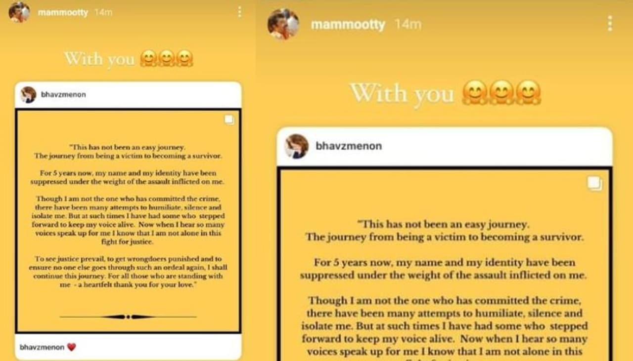 ഇൻസ്റ്റാഗ്രാം സ്റ്റോറിയിലൂടെ ആയിരുന്നു മമ്മൂട്ടിയുടെ പിന്തുണ.