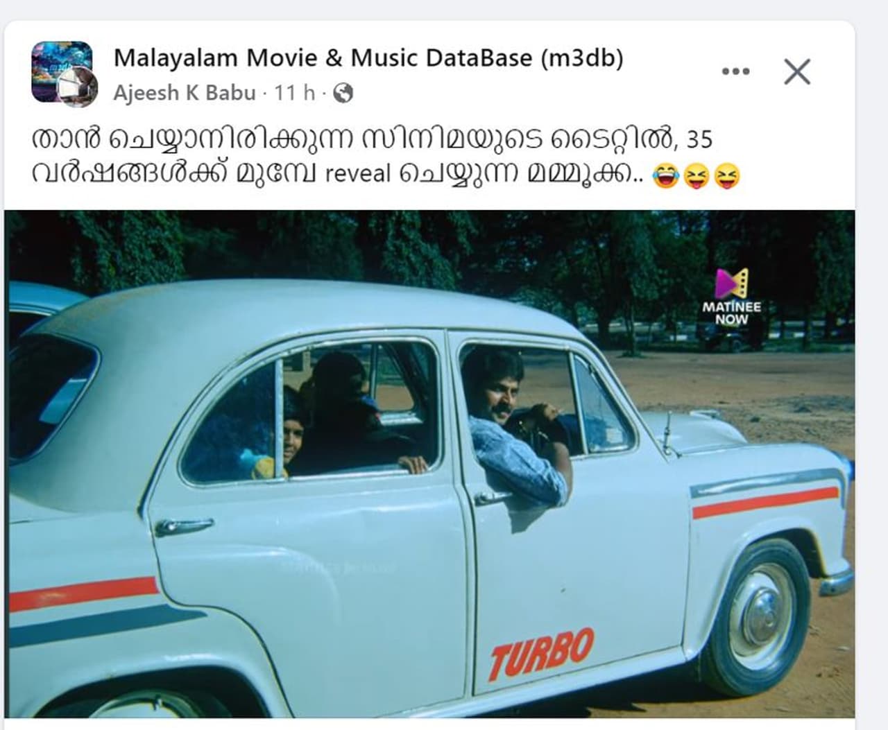 1988 ല് ഇറങ്ങിയ മനു അങ്കിള് എന്ന ചിത്രത്തിലെ ഒരു രംഗത്തില് മമ്മൂട്ടി ഓടിക്കുന്ന അംബാസിഡര് കാറില് 'ടര്ബോ' എന്ന് എഴുതിയിരിക്കുന്നു എന്നാണ് കണ്ടെത്തല് 'താൻ ചെയ്യാനിരിക്കുന്ന സിനിമയുടെ ടൈറ്റിൽ, 35 വർഷങ്ങൾക്ക് മുമ്പേ പുറത്തുവിട്ട മമ്മൂക്ക' എന്നാണ് പോസ്റ്റിന്റെ ക്യാപ്ഷന്.