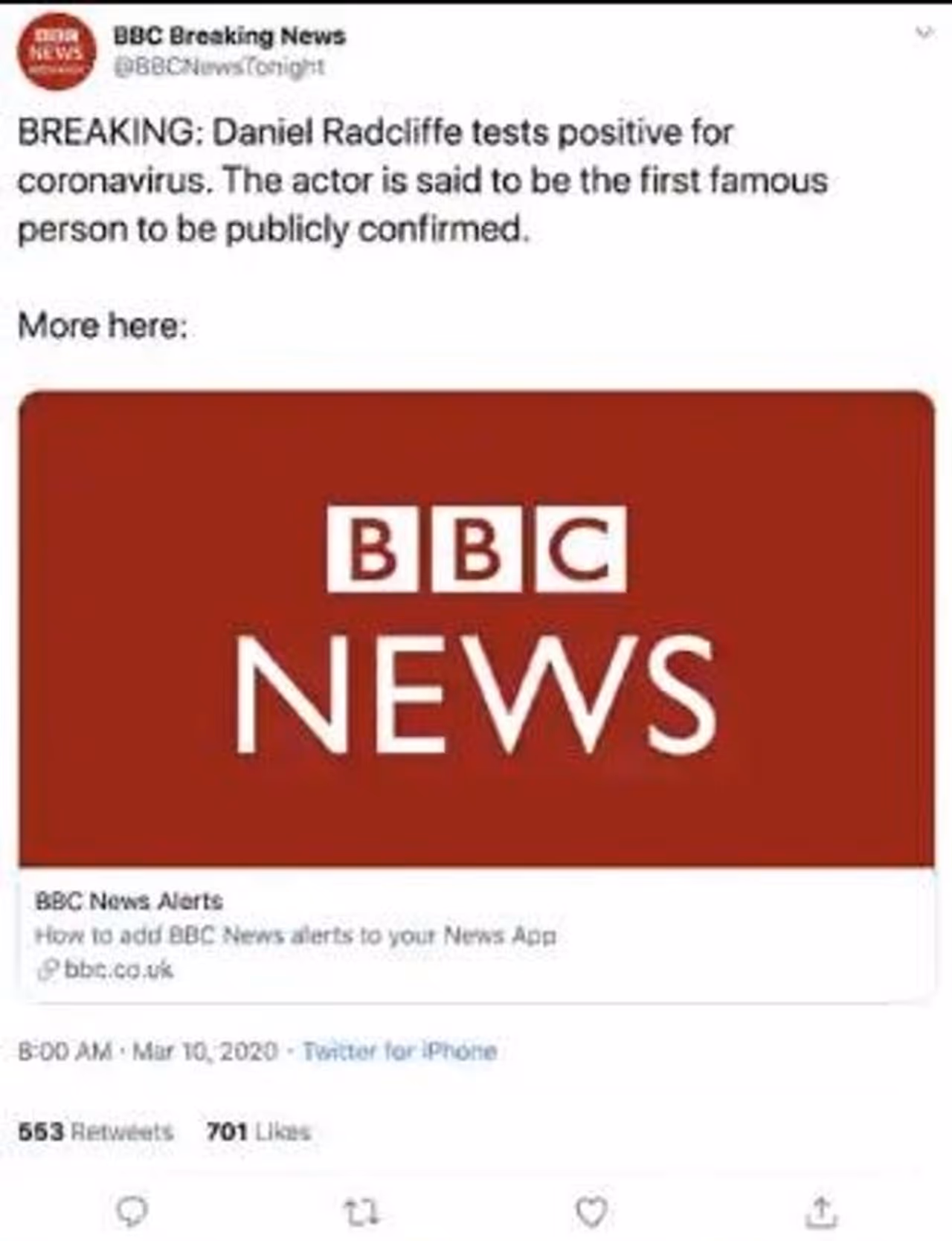 ഡാനിയേല് റാഡ്ക്ലിഫിന്റെ കൊവിഡ് 19 പരിശോധനാഫലം പോസിറ്റീവാണെന്നും കൊവിഡ് 19 ബാധിച്ച ആദ്യ സെലിബ്രിറ്റി അദ്ദേഹമാണെന്നുമാണ് ട്വീറ്റ്. ബിബിസിയുടെ ലോഗോയില് പ്രചരിച്ചതു കൊണ്ട് തന്നെ നിരവധി ആളുകള് ഈ ട്വീറ്റ് പങ്കുവെക്കുകയും ചെയ്തു. എന്നാല് സ്ക്രീന്ഷോട്ടുകള് വ്യാപകമായതോടെ വിശദീകരണവുമായി റാഡ്ക്ലിഫിന്റെ മാനേജര് രംഗത്തെത്തി.