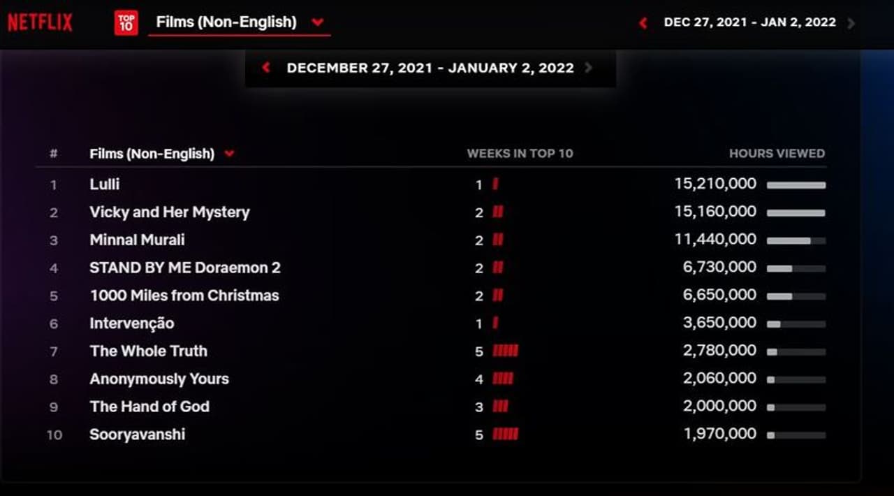 ഇംഗ്ലീഷ് ഇതര ചിത്രങ്ങളുടെ ഡിസംബര് 27 മുതല് ജനുവരി 2 വരെയുള്ള കാലയളവിലാണ് 'മുരളി' വീണ്ടും നേട്ടമുണ്ടാക്കിയിരിക്കുന്നത്. ലിസ്റ്റില് മൂന്നാം സ്ഥാനത്താണ് ചിത്രം. ലുല്ലി, വിക്കി ആന്ഡ് ഹെര് മിസ്റ്ററി എന്നിവയാണ് ആദ്യ രണ്ട് സ്ഥാനങ്ങളില്. 1.14 കോടി മണിക്കൂറുകളുടെ കാഴ്ചയാണ് മിന്നല് മുരളി നെറ്റ്ഫ്ലിക്സിന് നേടിക്കൊടുത്തിരിക്കുന്നത്. തുടര്ച്ചയായ രണ്ടാം വാരമാണ് നെറ്റ്ഫ്ലിക്സിന്റെ ഗ്ലോബല് ടോപ്പ് 10ല് മിന്നല് മുരളി ഇടംപിടിക്കുന്നത്.