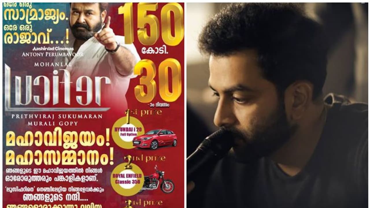 മോഹൻലാലിനെ നായകനാക്കി, പൃഥ്വിരാജ് ഒരുക്കിയ ലൂസിഫര് തീയേറ്ററില് മികച്ച പ്രതികരണവുമായി പ്രദര്ശനം തുടരുകയാണ്. ചിത്രം 150 കോടിയിലധികം കളക്ഷൻ നേടിയിരുന്നു. ഇപ്പോഴിതാ ചിത്രത്തിന്റെ വിജയാഘോഷങ്ങളുടെ ഭാഗമായി സമ്മാനങ്ങളും പ്രഖ്യാപിച്ചിരിക്കുന്നു. പൃഥ്വിരാജ് സാമൂഹ്യമാധ്യമത്തിലൂടെയാണ്, സമ്മാനങ്ങള് നല്കുന്ന കാര്യം അറിയിച്ചത്. സിനിമ കാണുന്നവരില് നിന്ന് നറുക്കെടുപ്പിലൂടെയാണ് വിജയികളെ തെരഞ്ഞെടുക്കുക.