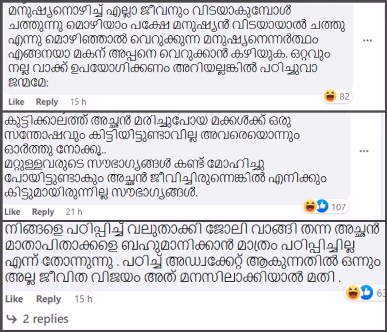 "ആദ്യത്തെ സൈക്കിളിൽ ചത്തുപോയ അച്ഛനോടൊപ്പം. My first cycle and my dead father.." എന്നാണ് ചിത്രത്തിന്റെ അടിക്കുറിപ്പ്. ഇത് ഒരു സിനിമാ കഥാപാത്രത്തിന്റെ പേരിലുള്ള ഫേസ്ബുക്ക് പേജ് ആണെന്നറിയാതെ നിരവധി പേരാണ് ഭാഷാപ്രയോഗത്തിലെ ഔചിത്യമില്ലായ്മയെ ചൂണ്ടിക്കാട്ടി രംഗത്തെത്തിയിരിക്കുന്നത്. ചത്തു എന്ന് മനുഷ്യരുടെ കാര്യത്തില് പറയാറില്ലെന്നും പട്ടിയും പൂച്ചയുമല്ലല്ലോ സ്വന്തം പിതാവല്ലേ മരിച്ചതെന്നുമൊക്കെ കമന്റുകള് പ്രവഹിക്കുന്നുണ്ട്. പുതിയ കമന്റുകളും സംവാദവുമൊക്കെ കാണാനെത്തുന്ന നിരവധിപേരും ചേര്ന്നാണ് ഈ പോസ്റ്റിനെ വൈറല് ആക്കിയിരിക്കുന്നത്.