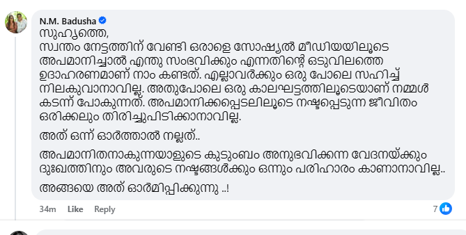 "സുഹൃത്തെ, സ്വന്തം നേട്ടത്തിന് വേണ്ടി ഒരാളെ സോഷ്യൽ മീഡിയയിലൂടെ അപമാനിച്ചാൽ എന്തു സംഭവിക്കും എന്നതിൻ്റെ ഒടുവിലത്തെ ഉദാഹരണമാണ് നാം കണ്ടത്. എല്ലാവർക്കും ഒരു പോലെ സഹിച്ച് നിലകുവാനാവില്ല. അതുപോലെ ഒരു കാലഘട്ടത്തിലൂടെയാണ് നമ്മൾ കടന്ന് പോകുന്നത്. അപമാനിക്കപ്പെടലിലൂടെ നഷ്ടപ്പെടുന്ന ജീവിതം ഒരിക്കലും തിരിച്ചുപിടിക്കാനാവില്ല. അത് ഒന്ന് ഓർത്താൽ നല്ലത്..അപമാനിതനാകുന്നയാളുടെ കുടുംബം അനുഭവിക്കന്ന വേദനയ്ക്കും ദുഃഖത്തിനും അവരുടെ നഷ്ടങ്ങൾക്കും ഒന്നും പരിഹാരം കാണാനാവില്ല.. അങ്ങയെ അത് ഓർമിപ്പിക്കുന്നു.!", എന്നായിരുന്നു ബാദുഷയുടെ കമന്റ്.
