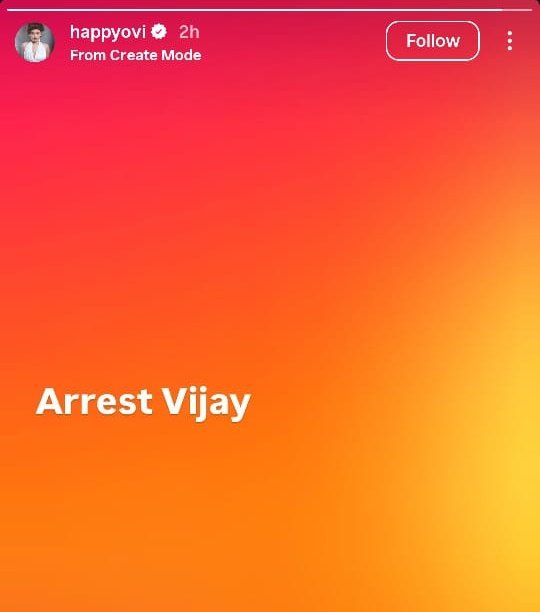 കരൂർ ദുരന്തത്തിന് പിന്നാലെ ടിവികെ നേതാവും നടനുമായ വിജയ്യെ അറസ്റ്റ് ചെയ്യണമെന്ന് നടി ഓവിയ. സമൂഹ മാധ്യമത്തിൽ പങ്കുവെച്ച സ്റ്റോറിയിലൂടെയായിരുന്നു താരത്തിന്റെ പ്രതികരണം. എന്നാൽ വലിയ രീതിയിൽ വിമർശനങ്ങൾ വന്നതോട് കൂടി ഇൻസ്റ്റാഗ്രാം സ്റ്റോറി ഡിലീറ്റ് ചെയ്യുകയുണ്ടായി. അതേസമയം എക്സിൽ അറസ്റ്റ് വിജയ് എന്ന പേരിൽ ഹാഷ്ടാഗുകൾ വലിയ രീതിയിൽ പ്രചരിക്കപ്പെടുന്നുണ്ട്.