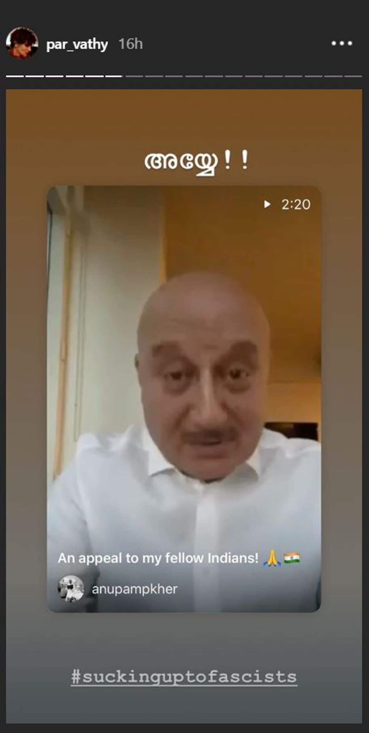 കേന്ദ്ര സര്ക്കാരിനെ അനുകൂലിച്ച ബോളിവുഡ് നടന് അനുപം ഖേറിനെതിരെ നടി പാര്വ്വതി.