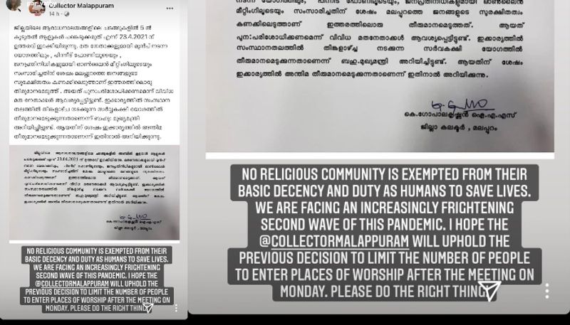 "മനുഷ്യര് എന്ന നിലയില് ജീവന് രക്ഷിക്കാനുള്ള കടമയില് നിന്നും ഒരു മതസമൂഹവും ഒഴിവാക്കപ്പെടുന്നില്ല. മഹാമാരിയുടെ ഭയപ്പെടുത്തുന്ന ഒരു രണ്ടാം തരംഗത്തെയാണ് നാം അഭിമുഖീകരിക്കുന്നത്. തിങ്കളാഴ്ചത്തെ യോഗത്തിനു ശേഷം ആരാധനാലയങ്ങളിലെ പ്രവേശനത്തിന് ഏര്പ്പെടുത്തിയ നിയന്ത്രണം മലപ്പുറം കളക്ടര് പുനസ്ഥാപിക്കുമെന്ന് പ്രതീക്ഷിക്കുന്നു. ദയവായി യുക്തിപൂര്വ്വം പ്രവര്ത്തിക്കുക", പാര്വ്വതി കുറിച്ചു.
