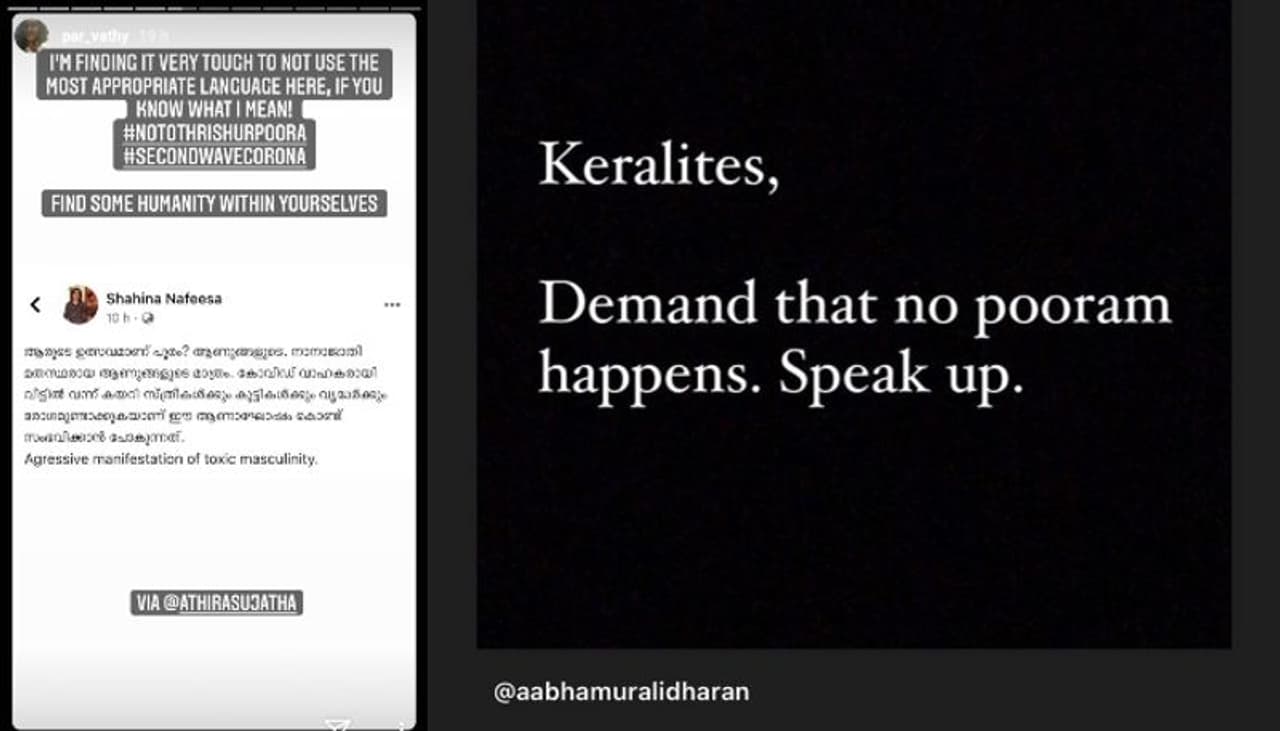 തൃശൂര് പൂരത്തിന് കൂടുന്ന പുരുഷാരത്തിലെ ലിംഗ അസമത്വത്തെക്കുറിച്ചും കൊവിഡ്കാലത്ത് അതു നടത്താനുള്ള ആലോചനയെ വിമര്ശിച്ചുമുള്ള മാധ്യമപ്രവര്ത്തക ഷാഹിന നഫീസയുടെ ഫേസ്ബുക്ക് പോസ്റ്റിന്റെ സ്ക്രീന് ഷോട്ടിനൊപ്പം പാര്വ്വതി കുറിച്ചിരിക്കുന്നത് ഇങ്ങനെ- "ഇവിടെ ശരിക്കും ഉപയോഗിക്കേണ്ട ഭാഷ ഉപയോഗിക്കാതിരിക്കുന്നതില് നല്ല പ്രയാസമുണ്ട്. ഞാന് എന്താണ് ഉദ്ദേശിച്ചതെന്ന് നിങ്ങള്ക്ക് മനസിലാവുന്നുണ്ടാവും. ഉള്ളില് അല്പ്പം മനുഷ്യത്വം കണ്ടെത്തുക", പാര്വ്വതി കുറിച്ചു. പൂരം നടത്തരുതെന്ന് അഭ്യര്ഥിച്ച് ചീഫ് സെക്രട്ടറിക്ക് മറ്റൊരാള് അയച്ച കത്തിന്റെ സ്ക്രീന് ഷോട്ടും പാര്വ്വതി ഇന്സ്റ്റഗ്രാം സ്റ്റോറിയായി ചേര്ത്തിട്ടുണ്ട്.
