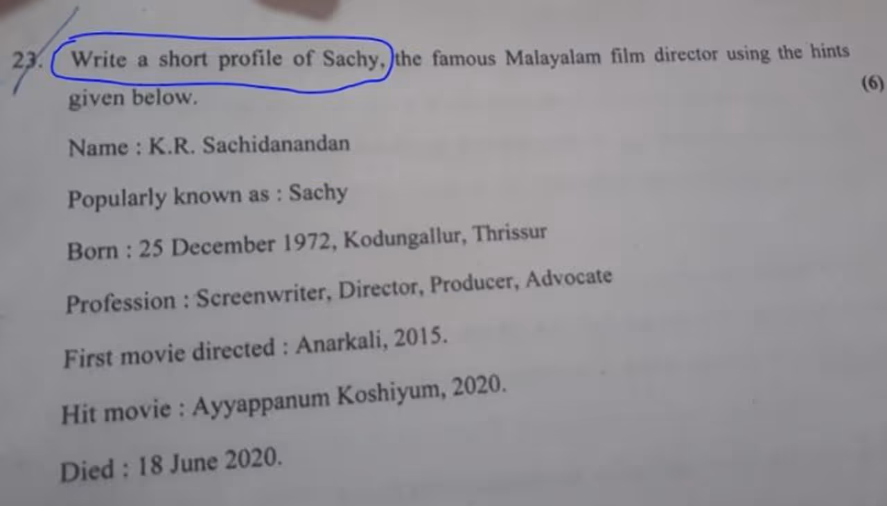 അകാലത്തിൽ പൊലിഞ്ഞ സംവിധായകൻ സച്ചിയെ കുറിച്ചുള്ള ചോദ്യവുമായി ഹയർസെക്കണ്ടറി പരീക്ഷയിലെ ഇംഗ്ലീഷ് ചോദ്യ പേപ്പർ. സച്ചിയുടെ ഒരു പ്രൊഫൈൽ എഴുതാനാണ് വിദ്യാർത്ഥികൾക്കുള്ള ചോദ്യം. അതിനായി എതാനും പോയിന്റുകളും ചോദ്യത്തിൽ ഉൾപ്പെടുത്തിയിരുന്നു. ഇന്ന് നടന്ന ഇംഗ്ലീഷ് പരീക്ഷയിലായിരുന്നു ചോദ്യം.