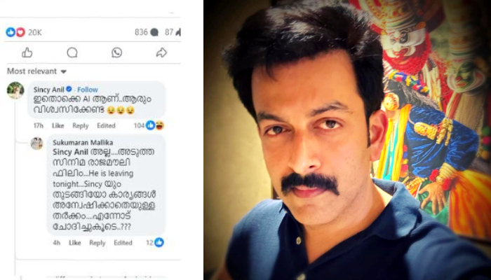 പൃഥ്വിരാജിന്റെ പോസ്റ്റിന് താഴെ വന്ന ഒരു കമന്റിന് മറുപടിയായാണ് മല്ലിക സുകുമാരന് ഇക്കാര്യം കുറിച്ചിരിക്കുന്നത്. ഇതൊക്കെ എഐ ആണ്. ആരും വിശ്വസിക്കേണ്ട എന്നായിരുന്നു കമന്റ്. ഇതിന് മല്ലിക സുകുമാരന്റെ മറുപടി ഇങ്ങനെ- അല്ല, അടുത്ത സിനിമ രാജമൗലി ഫിലിം. അവന് ഇന്ന് രാത്രി പോവുകയാണ്, മല്ലിക സുകുമാരന് കുറിച്ചു.