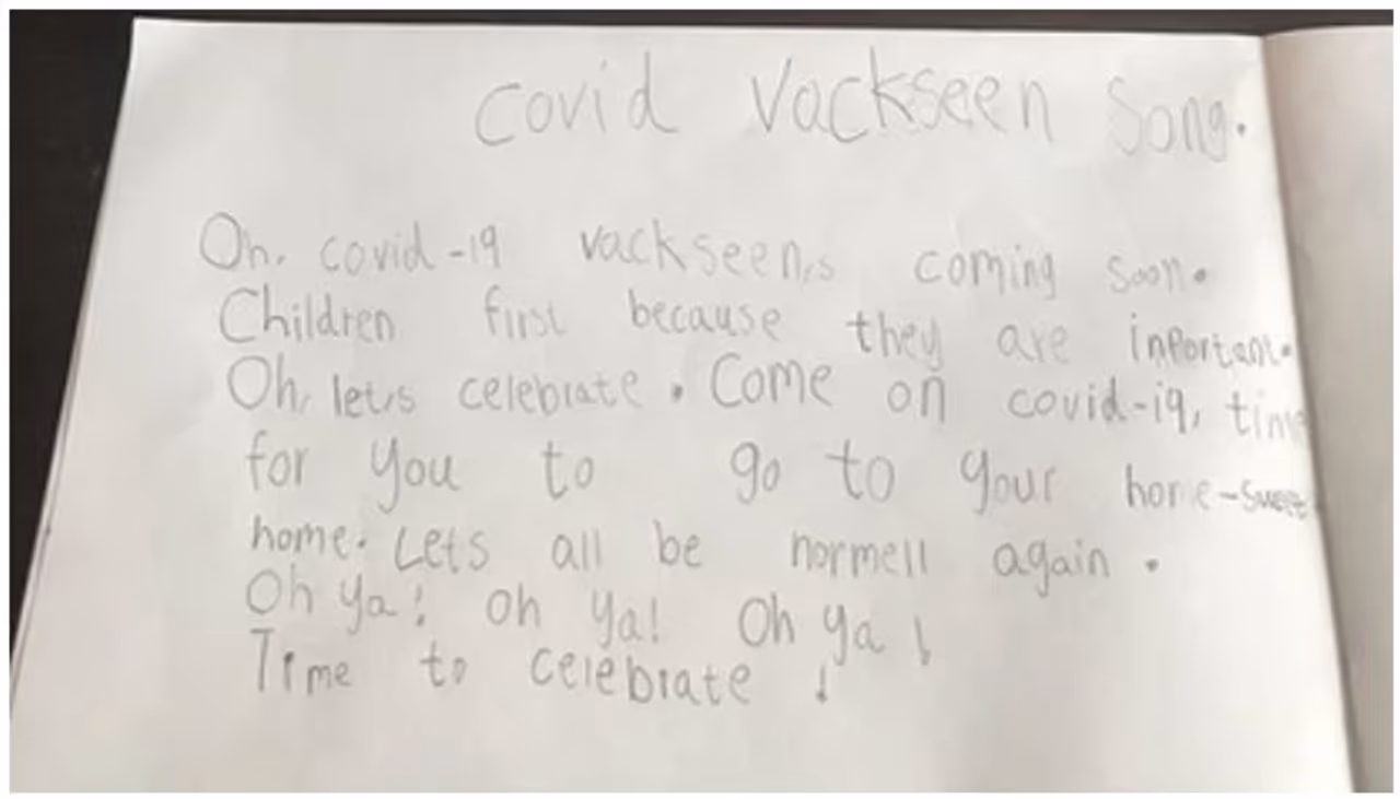 വാക്സിൻ വര്ഷം അവസാനത്തോടെ കണ്ടെത്തുമെന്ന് ഞാൻ അല്ലിയോട് പറഞ്ഞിരുന്നു (ഏറ്റവും ഒടുവിലത്തെ വാര്ത്ത അനുസരിച്ച്). തുടര്ന്ന് അവള് എല്ലാ ദിവസവും എന്നോട് ചില ചോദ്യങ്ങള് ചോദിച്ചിരുന്നു. എപ്പോഴാണ് വാക്സിൻ അവര് തരിക, ആര്ക്കാണ് ആദ്യം കിട്ടുകയെന്നൊക്കെ. ഇപ്പോള് അവള് അവളുടെ പാഠം തീര്ത്തിന് ശേഷം എന്നെ ഒരു കവിത കാണിച്ചു. അത് വാക്സിനെ കുറിച്ചുള്ളതായിരുന്നു. അക്ഷരത്തെറ്റുണ്ടെങ്കിലും അതിലെ ഇമോഷൻ കൃത്യമാണ് എന്നും കവിത പങ്കുവെച്ചുകൊണ്ട് സുപ്രിയ മേനോൻ പറയുന്നു.